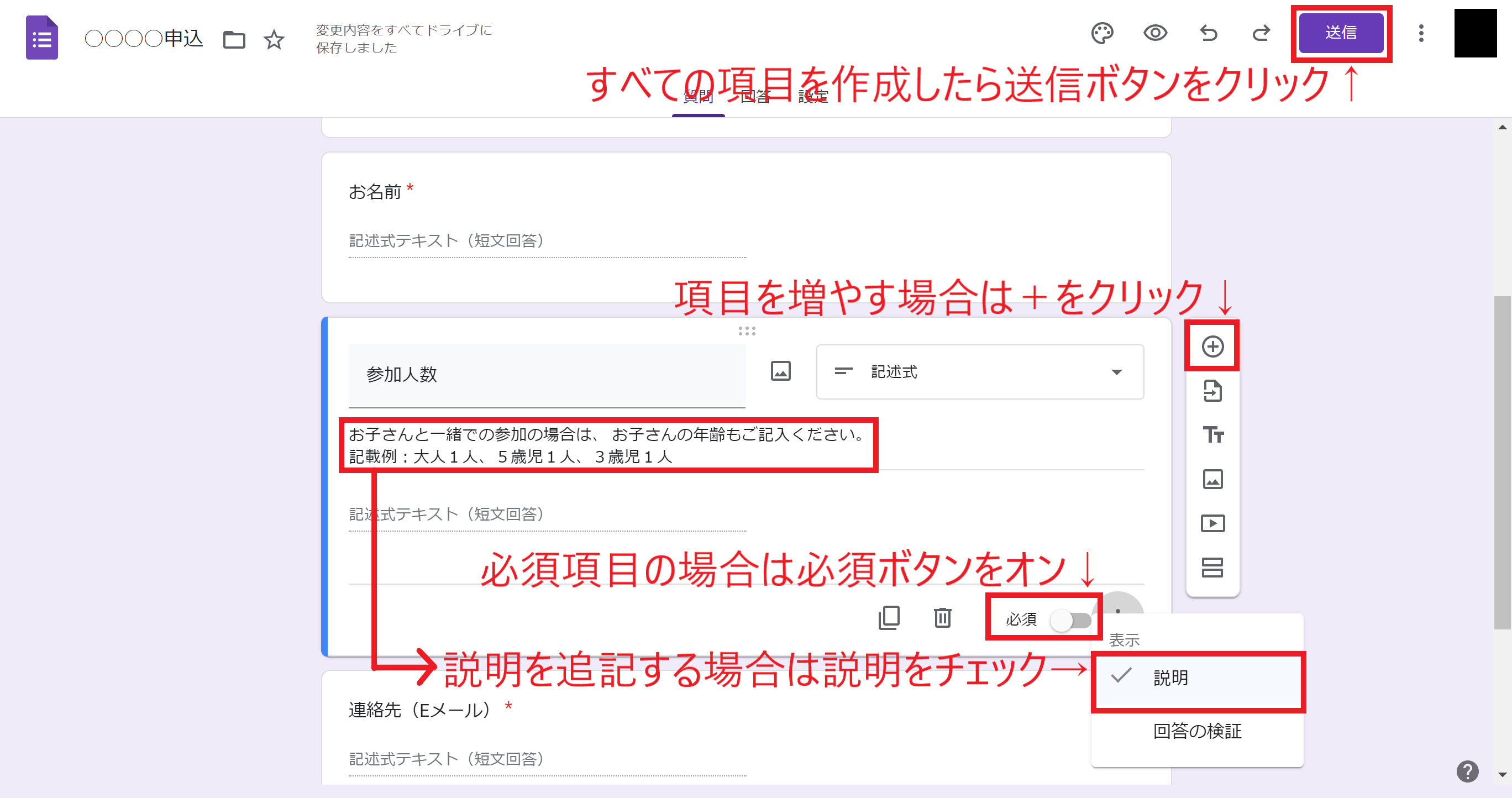 説明文を追記する場合は、項目の右下をクリックすると「説明」をチェックできるようになりますので、必要に応じて追記してください。
