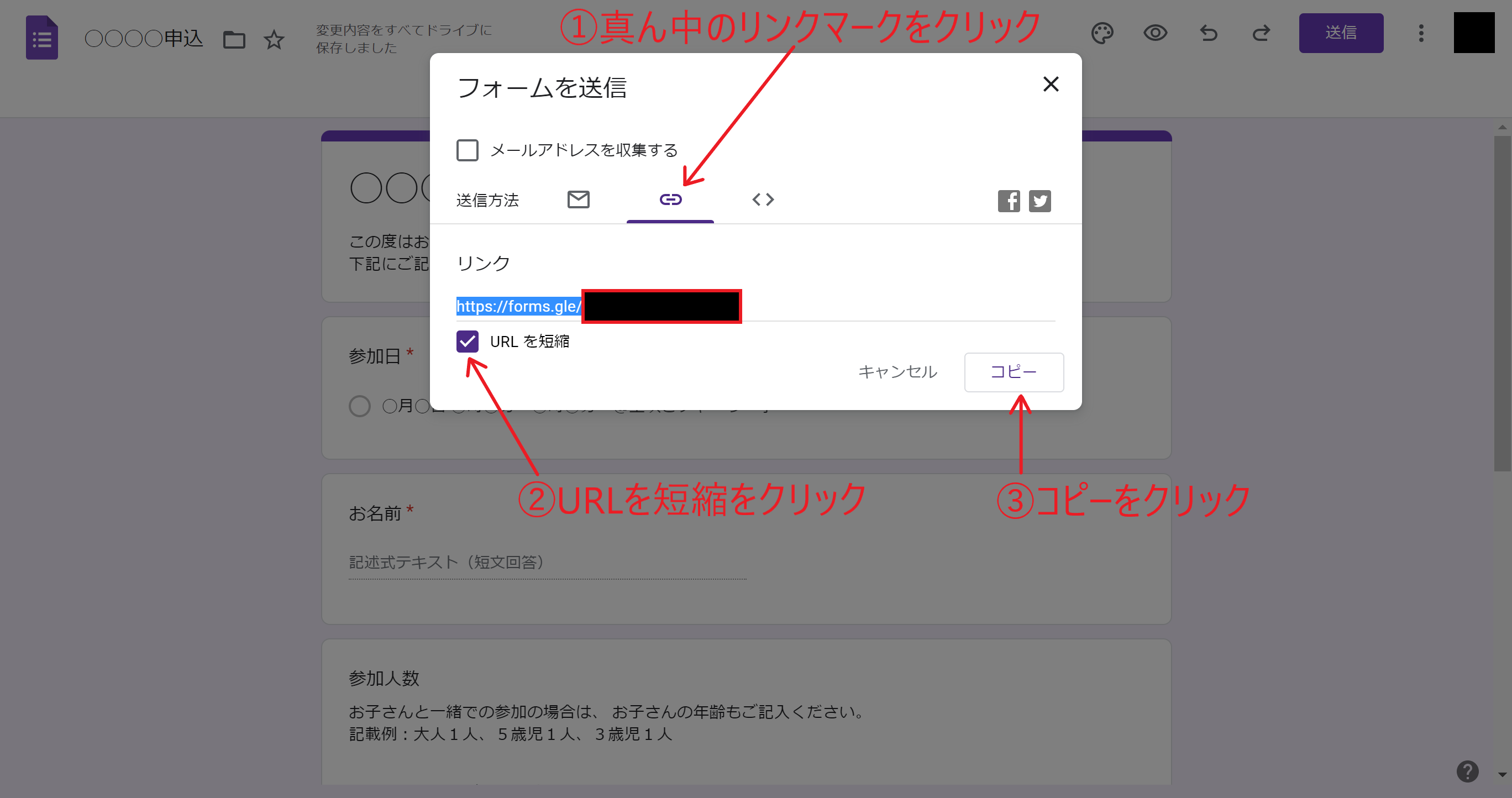すべての入力項目を作成できましたら、ページの一番右上の「送信」ボタンをクリックしてください。そうすると、画面のような表示がでますので、次の手順で進めれば、無事にGoogleフォームでの予約申込システムは完成です。