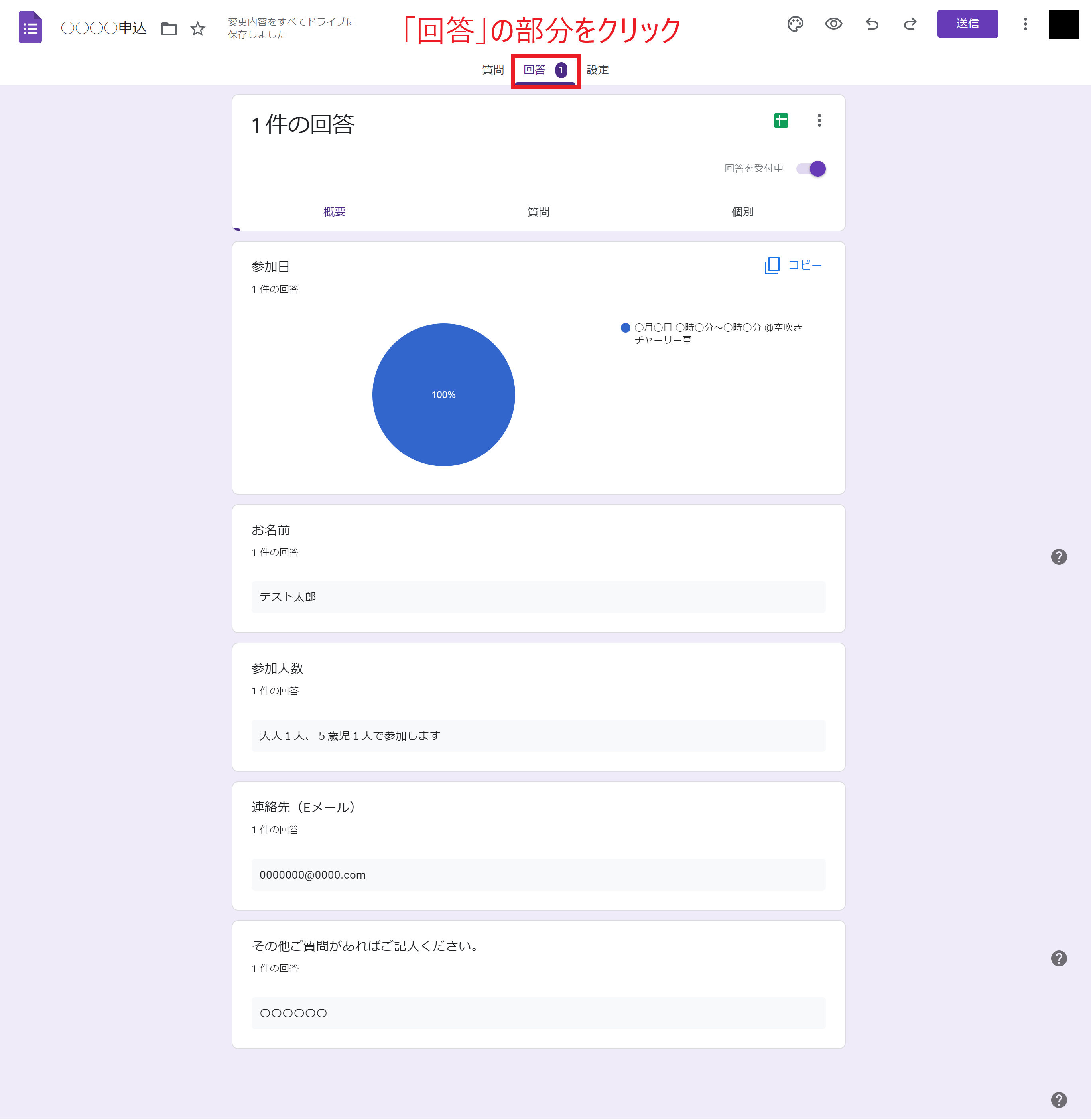 あとは、誰かから申込が入れば、自動的に回答のページに入力された個人情報が格納されていきます。