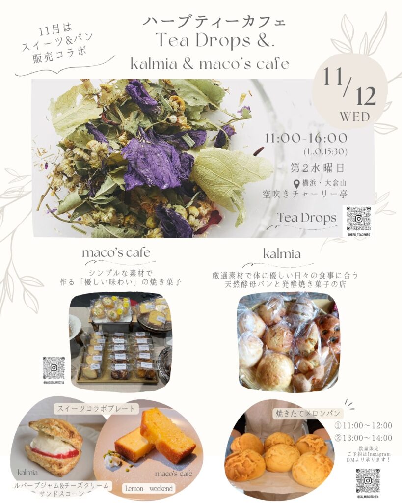 11月12日(水)のハーブティーカフェは、天然酵母のパン屋kalmiaさんと焼菓子工房maco’s cafeさんとのコラボになります。