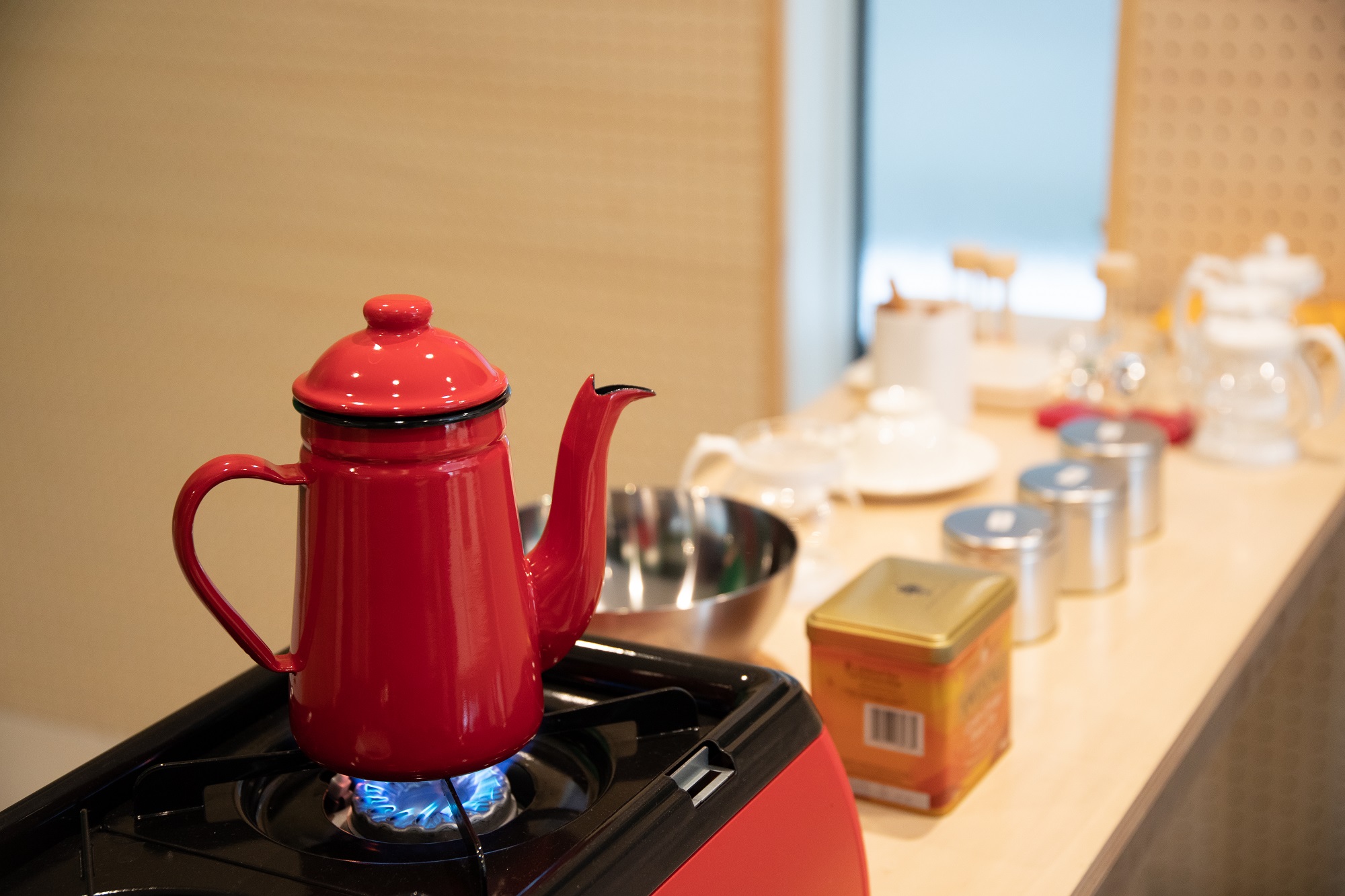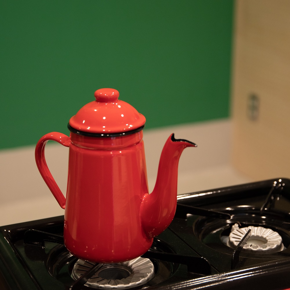 お湯を沸かすやかんは、赤い可愛いホーローやかん。