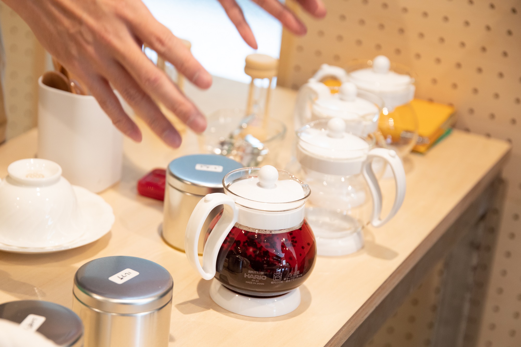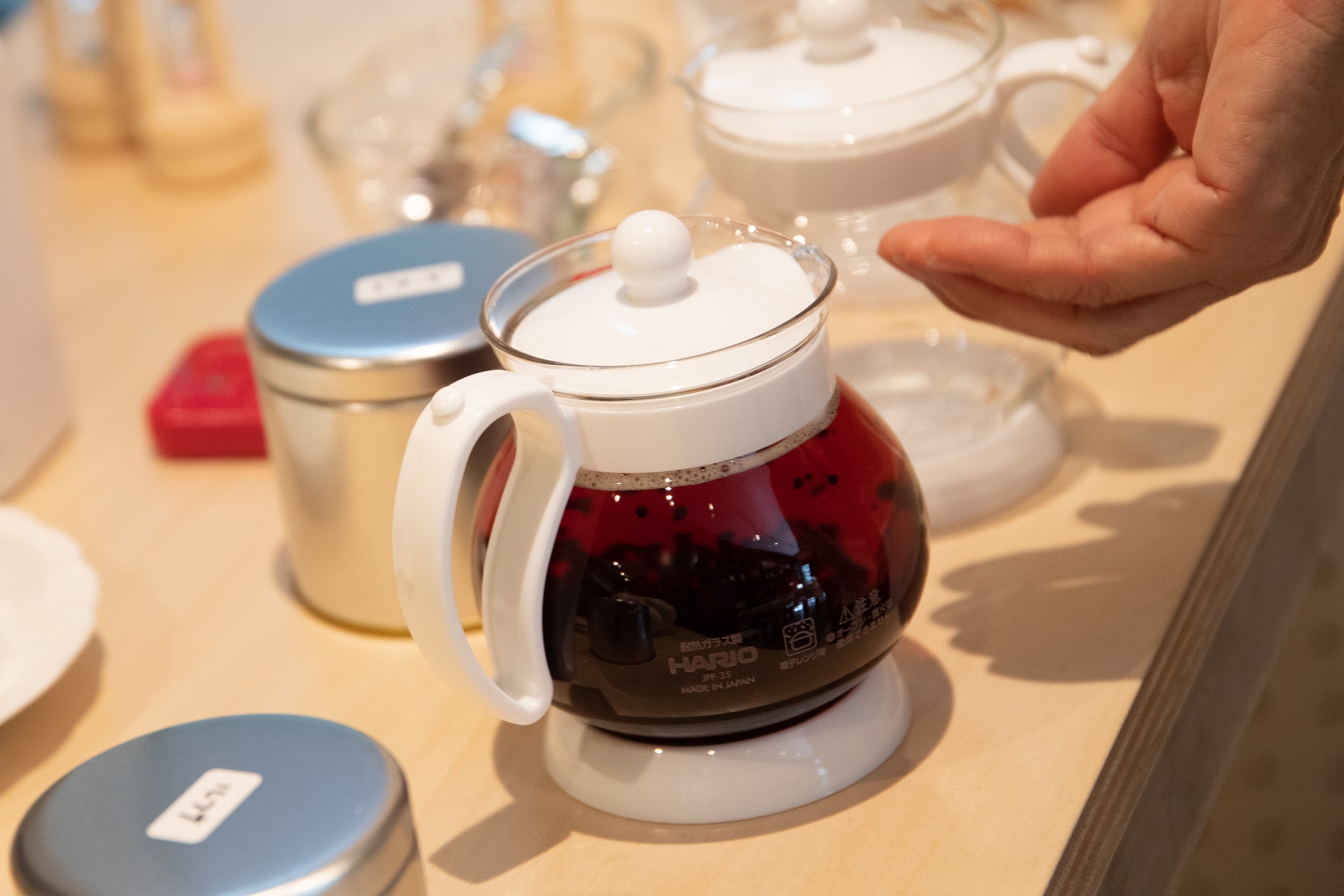 続いて、ティーポットですが、2杯分のHARIO(ハリオ) ジャンピングリーフポット(容量350ml)をご用意しています。