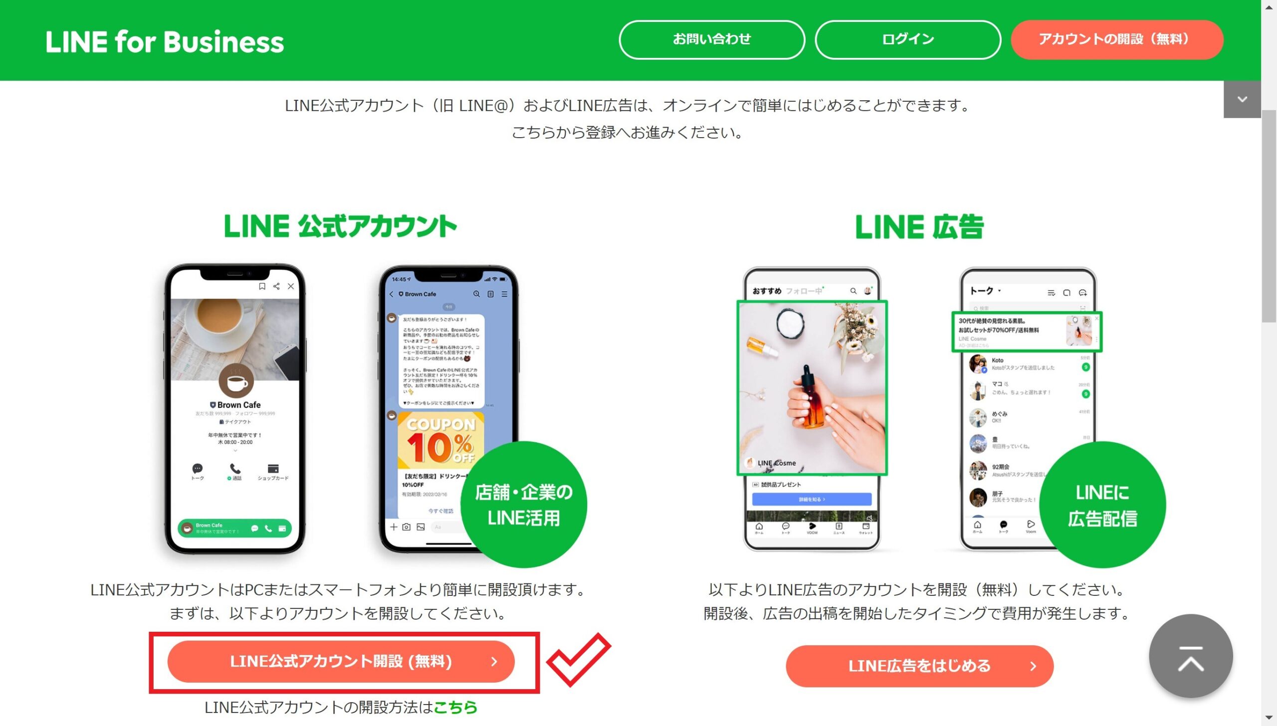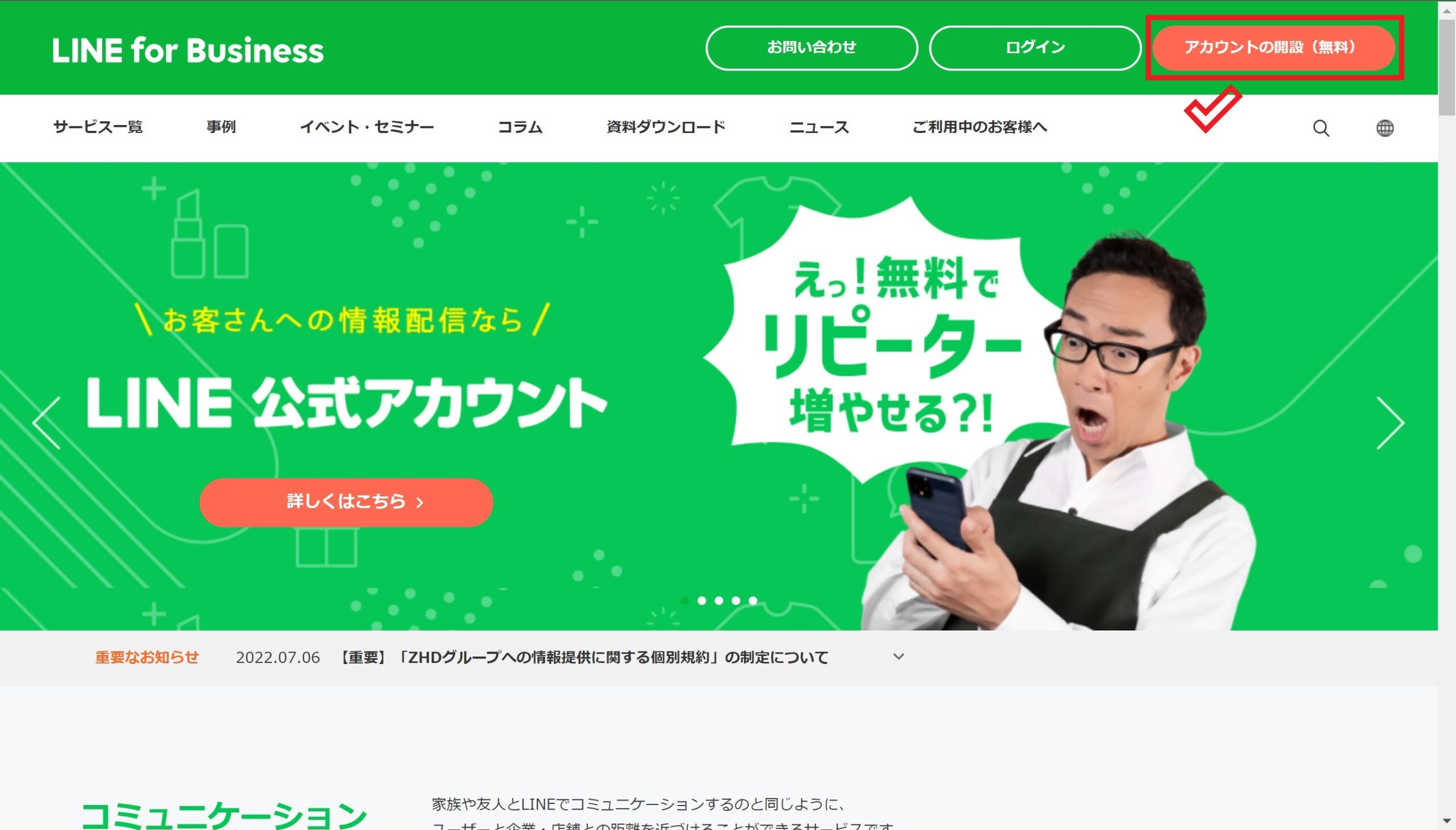 まずは、LINE公式アカウントのページにアクセスし、右上の「アカウントの開設(無料)」をクリックしてください。