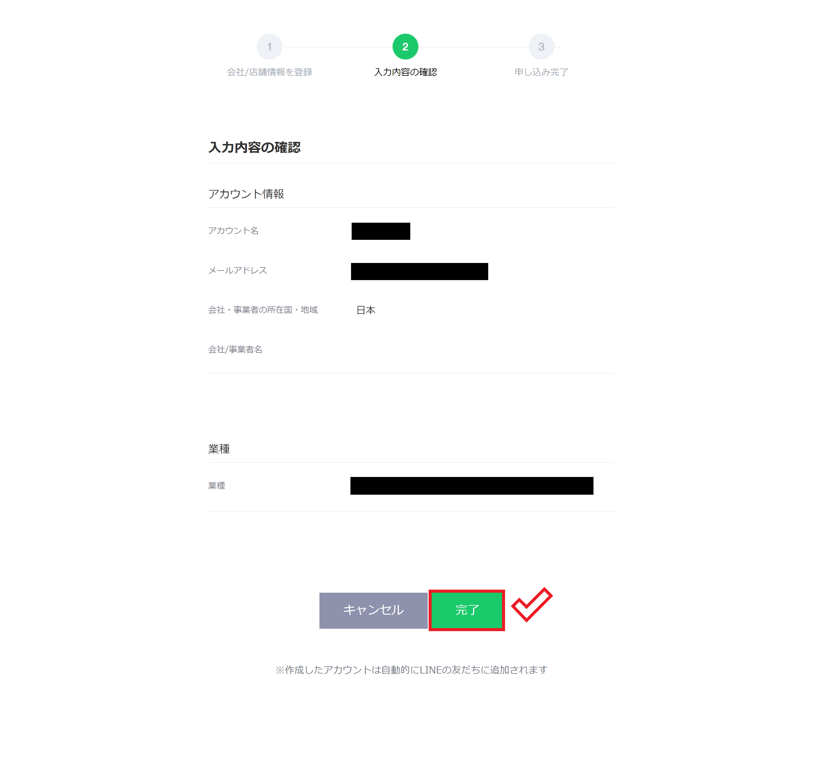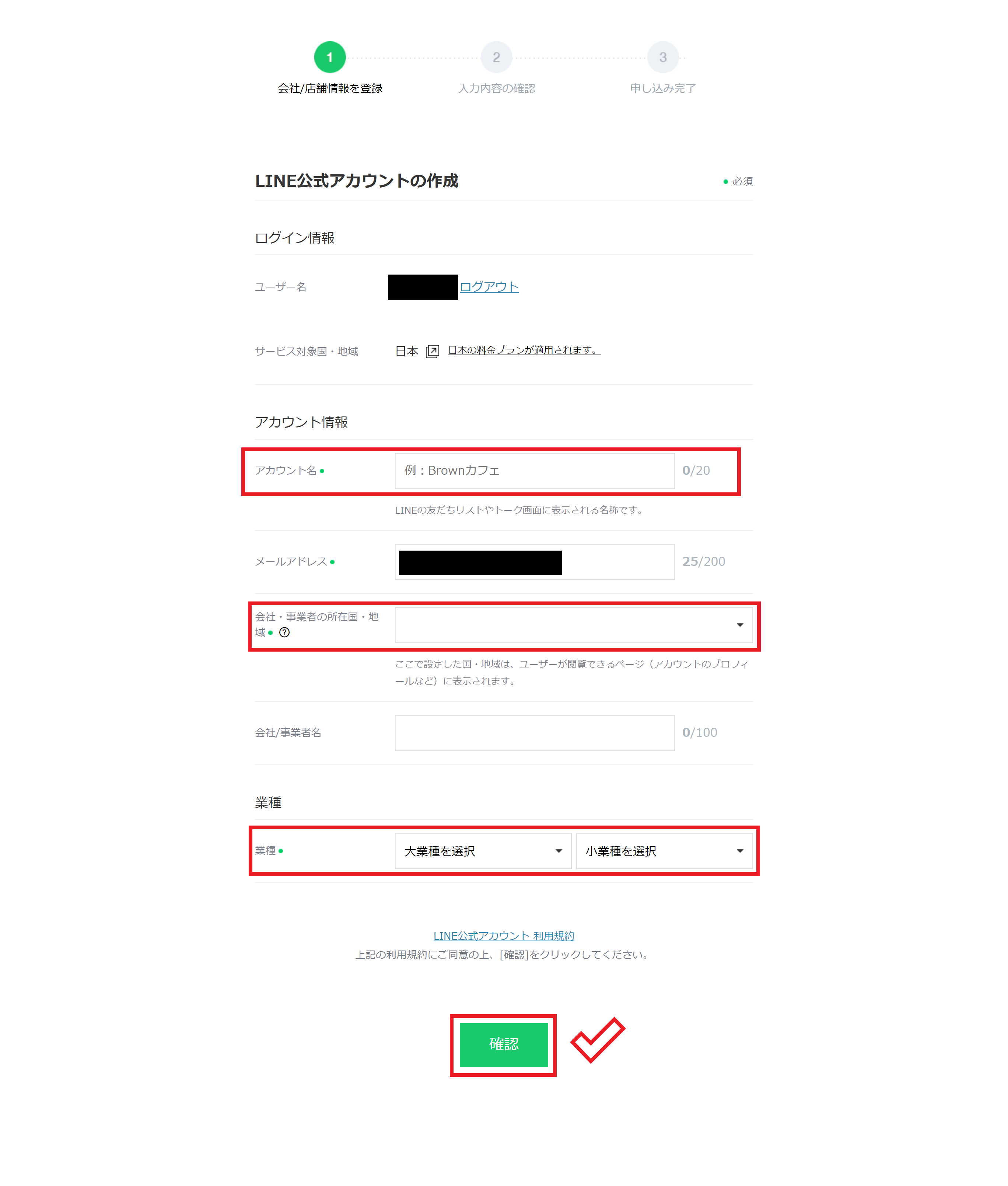 続いて、「アカウント名」に教室名・サークル活動団体名を入力し、「所在国・地域」を選択し、「業種」を選択して、最後に「確認」をクリックします。