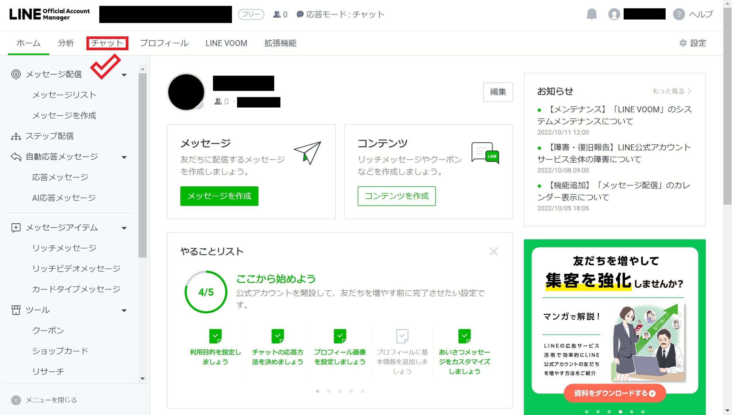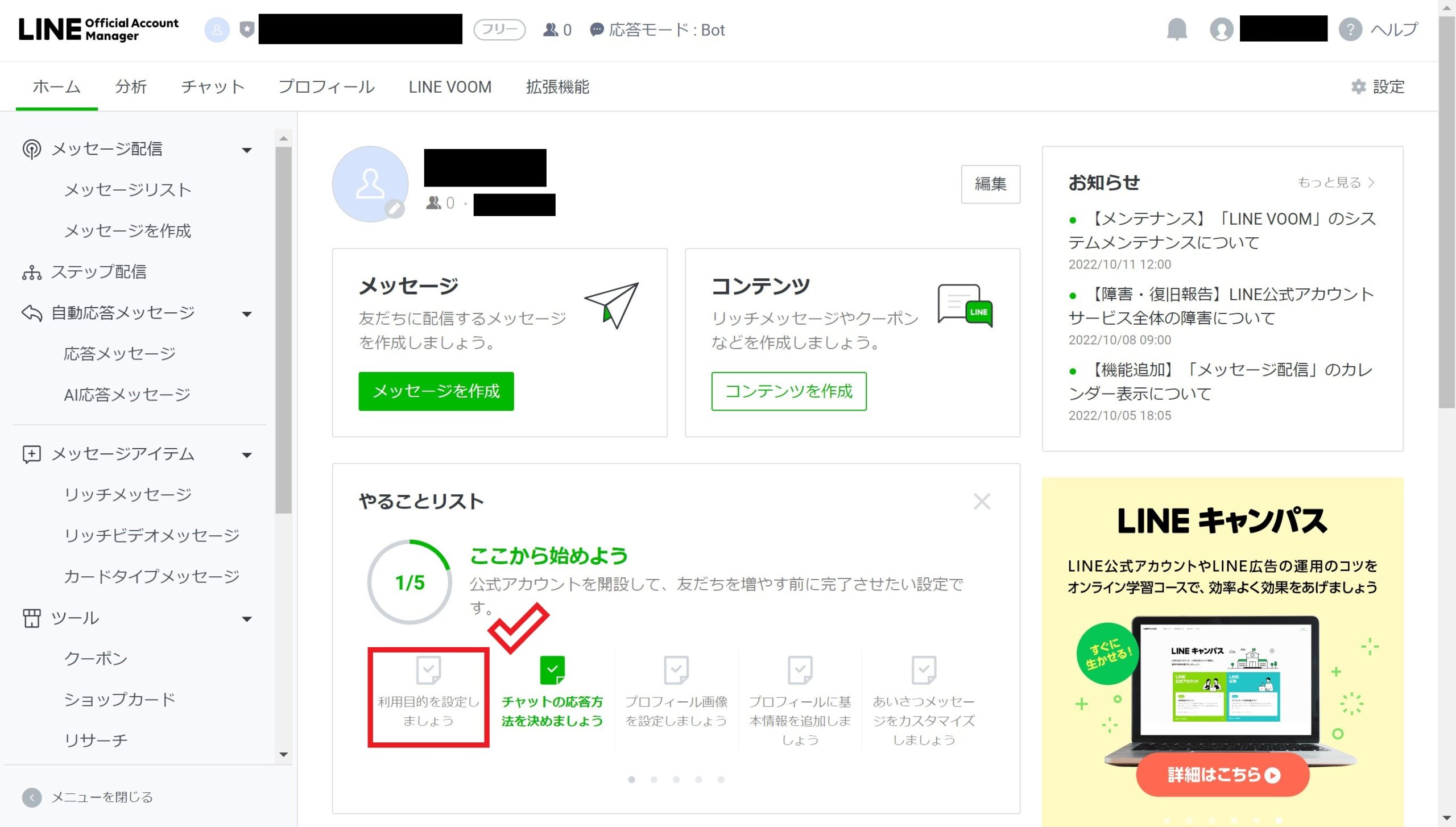 続いて、LINE公式アカウントのセットアップについて解説します。LINE公式アカウントの管理画面に入ったら、中央下の「やることリスト」に従ってセットアップをしていきます。