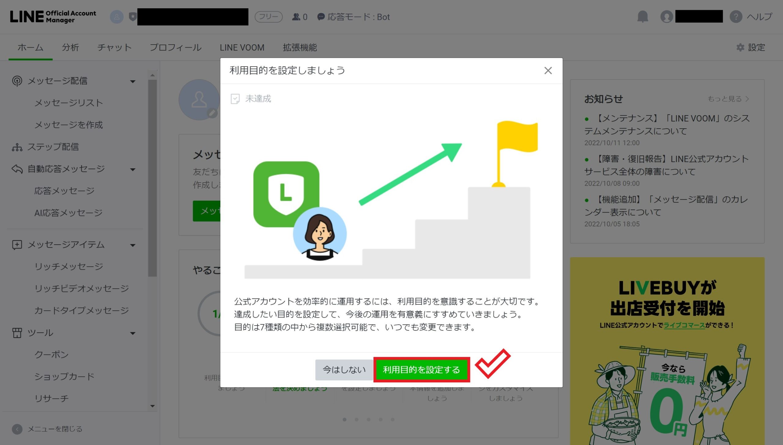ポップアップが表示されますので「利用目的を設定する」をクリックします。