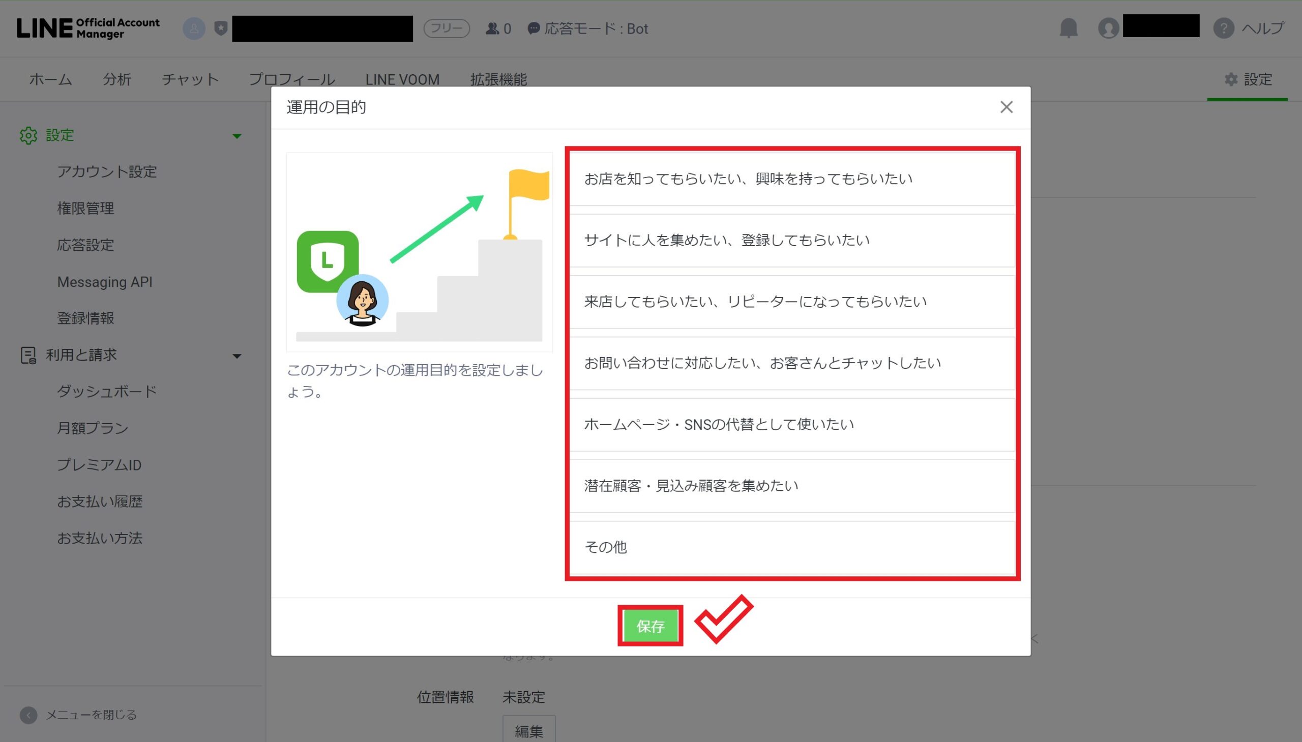 運用の目的を適宜選択して、「保存」をクリックします。