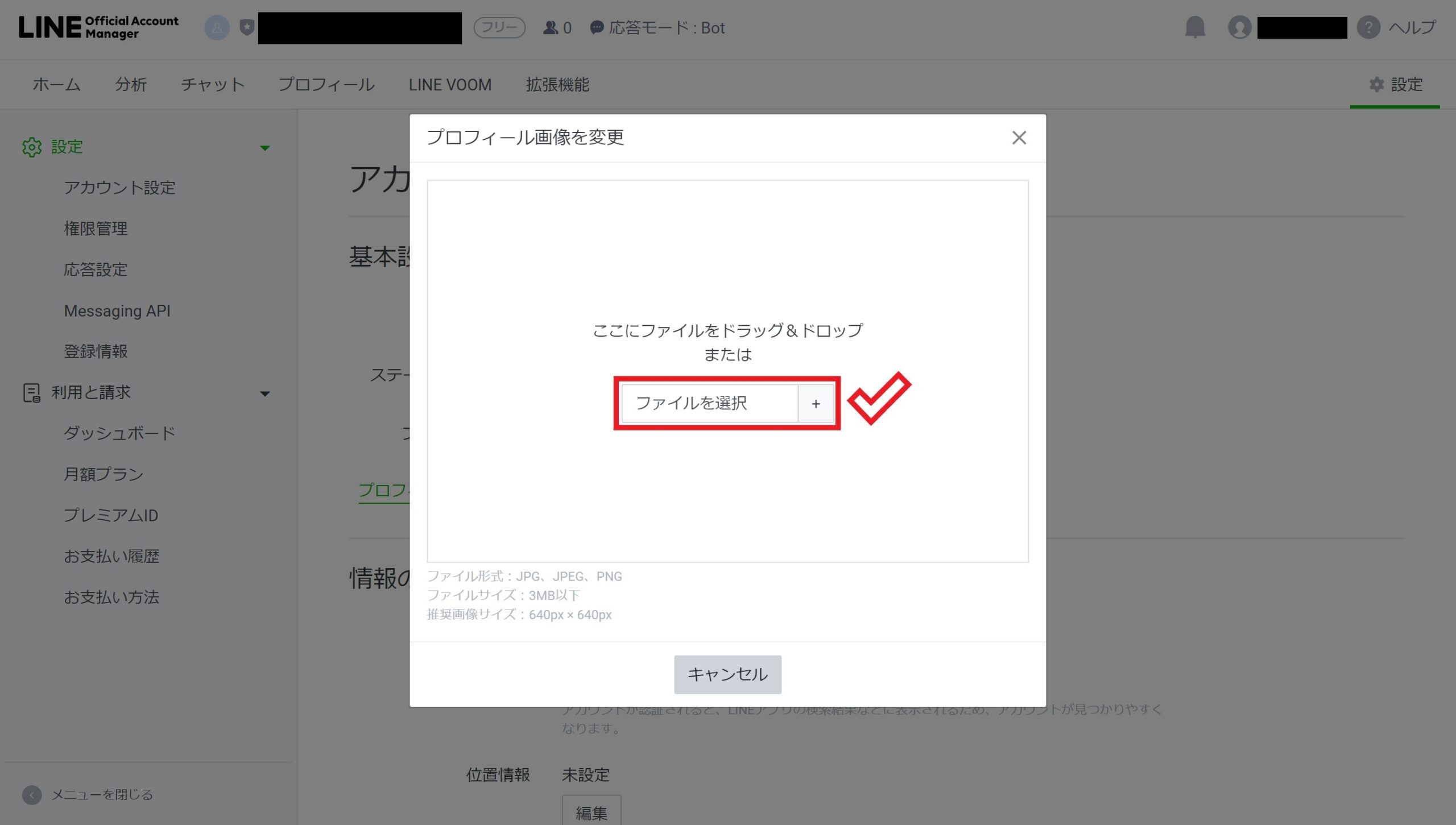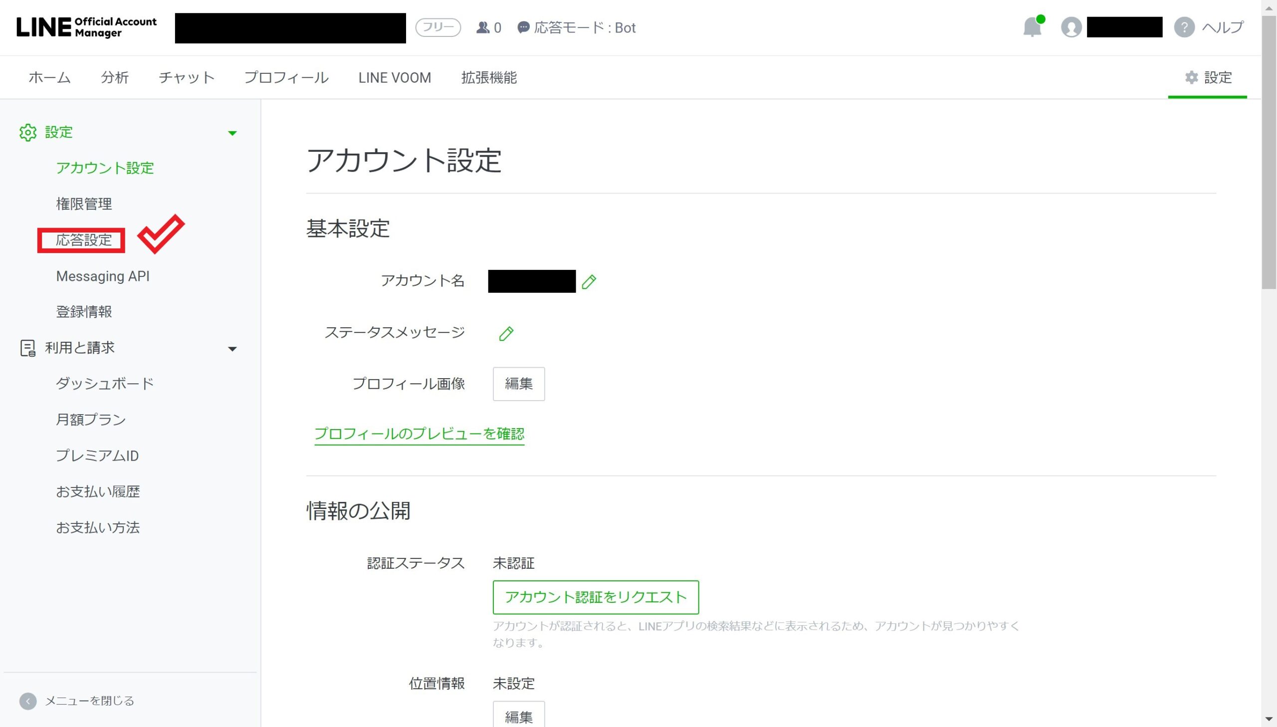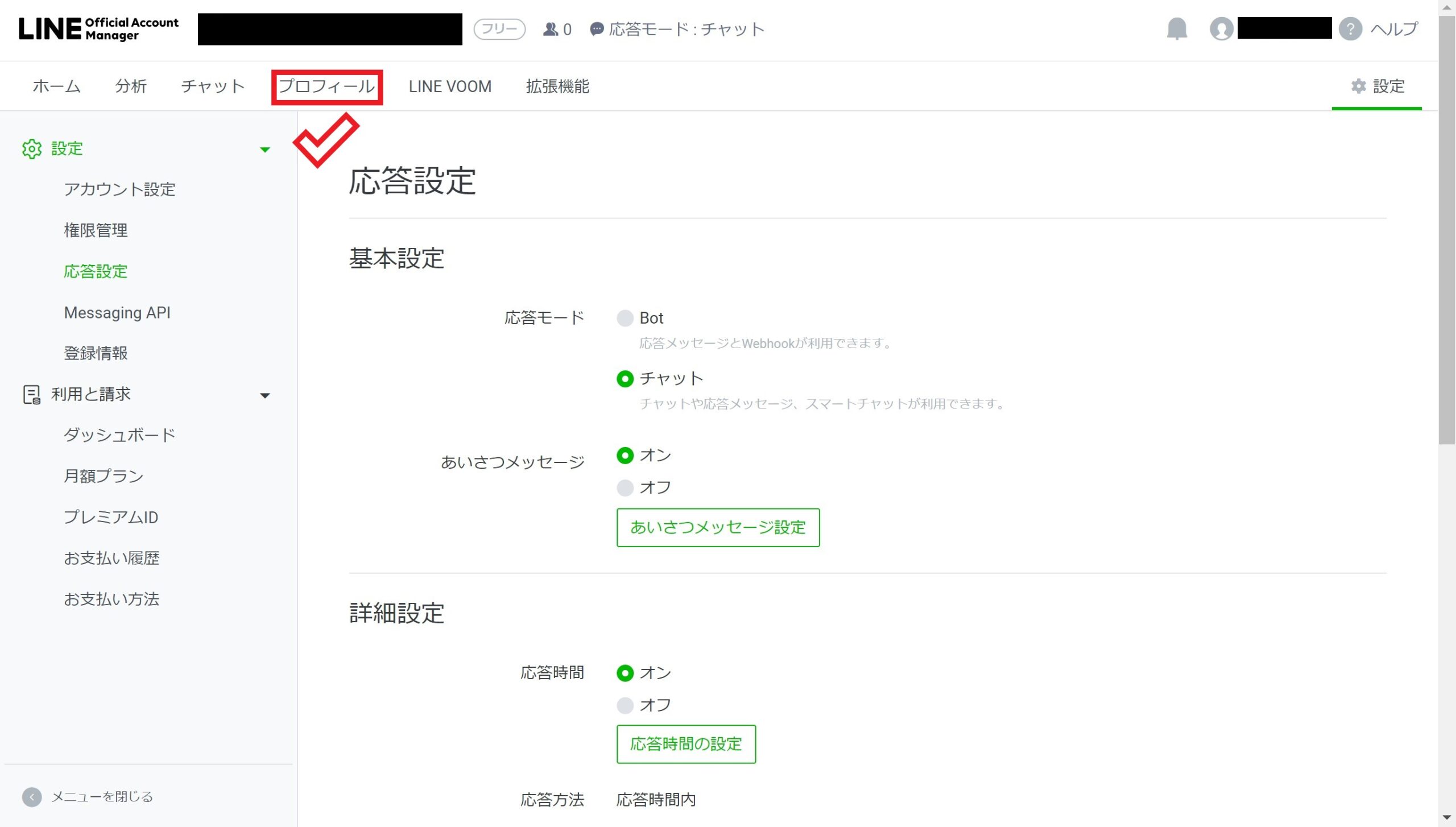 プロフィール画像が設定できたら、次は左側のメニューで「応答設定」をクリックします。