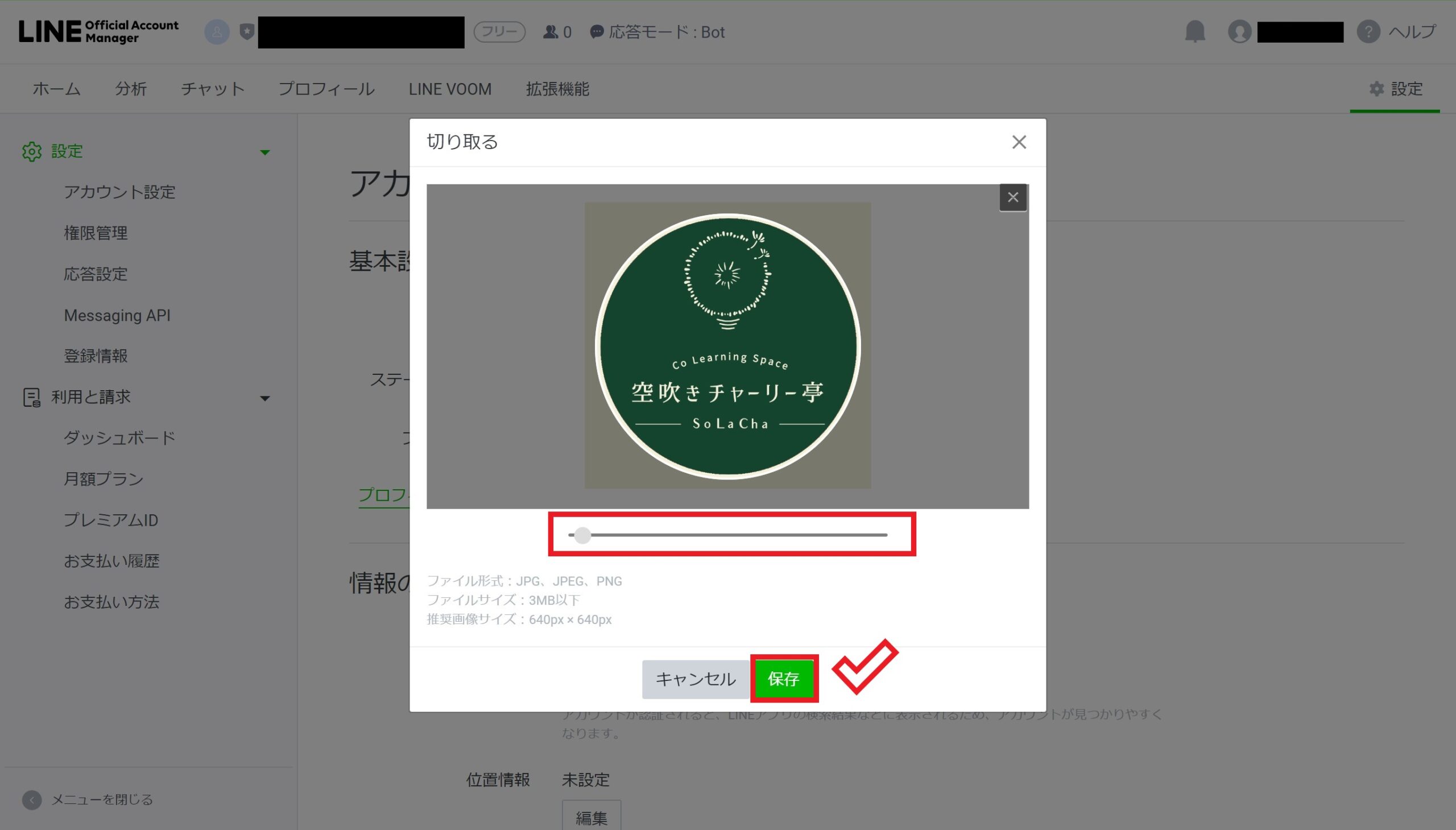 LINE公式アカウントのプロフィール画像は円形アイコンで表示されますので、選択したロゴデータなどの画像が、円形に収まるように「スライドバー」を調整し、丁度良い大きさに当てはまったら、「保存」をクリックします。