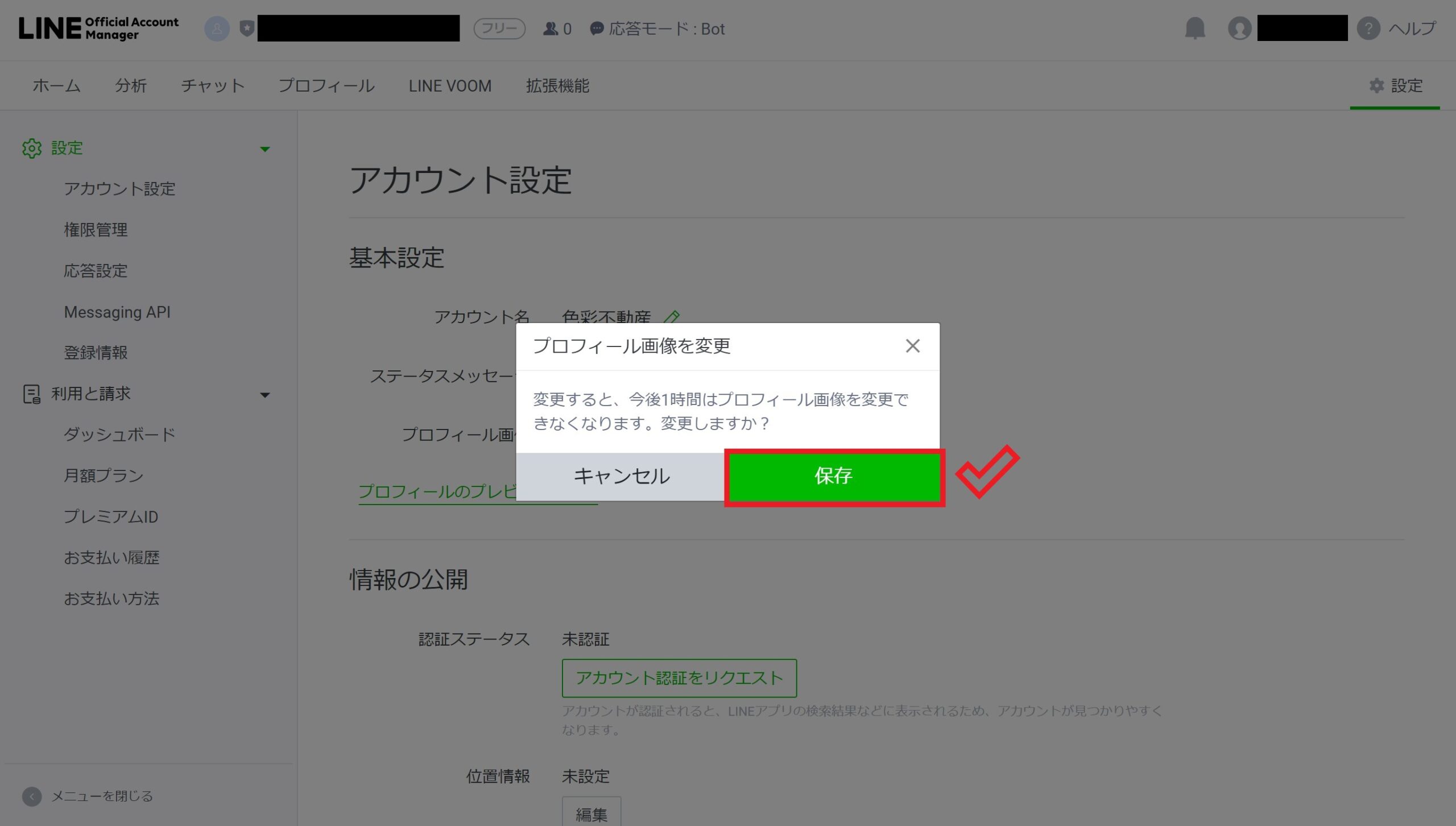 今後1時間はプロフィール画像を変更できない旨が表示されますが、問題なければ「保存」をクリックします。