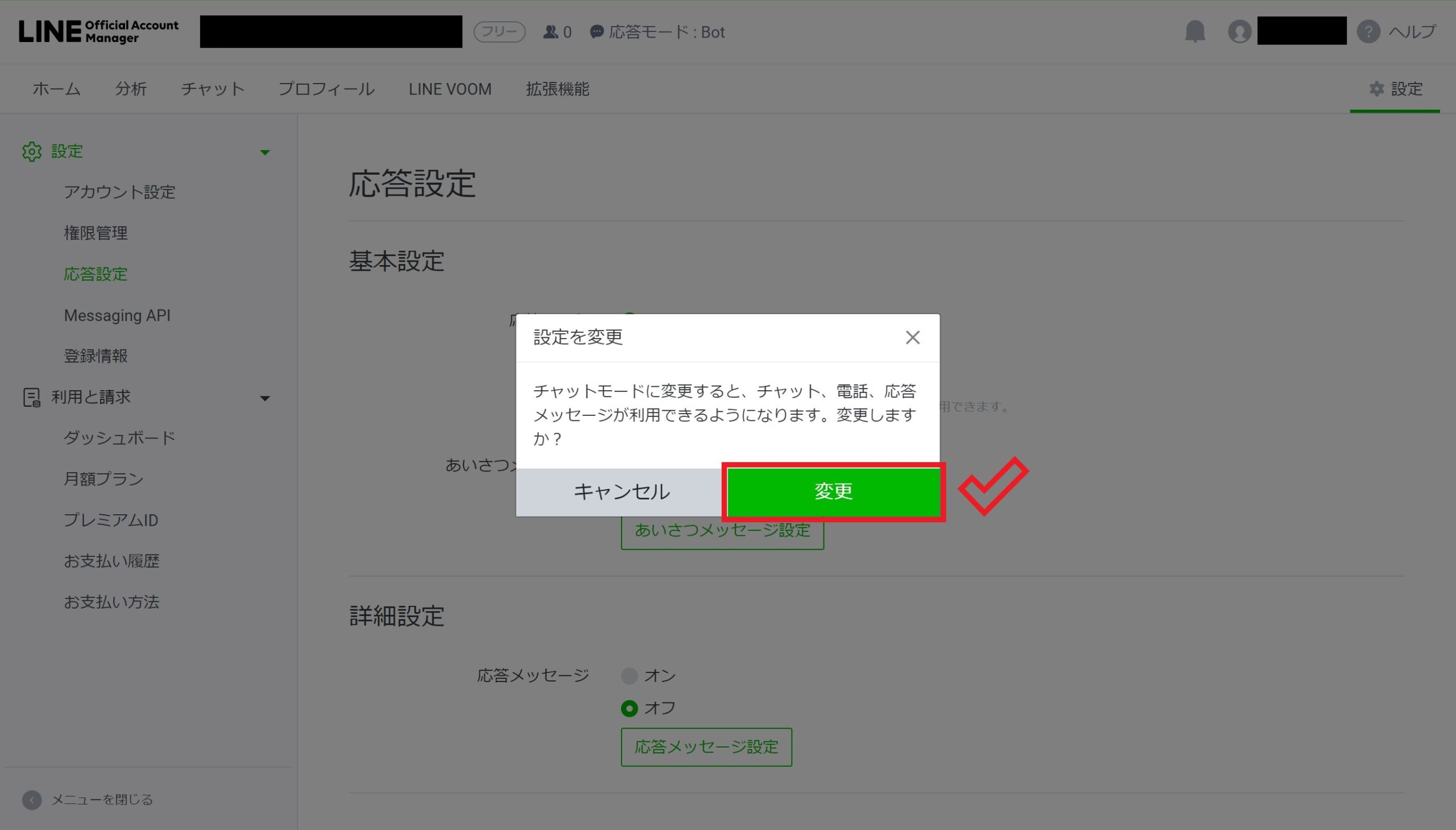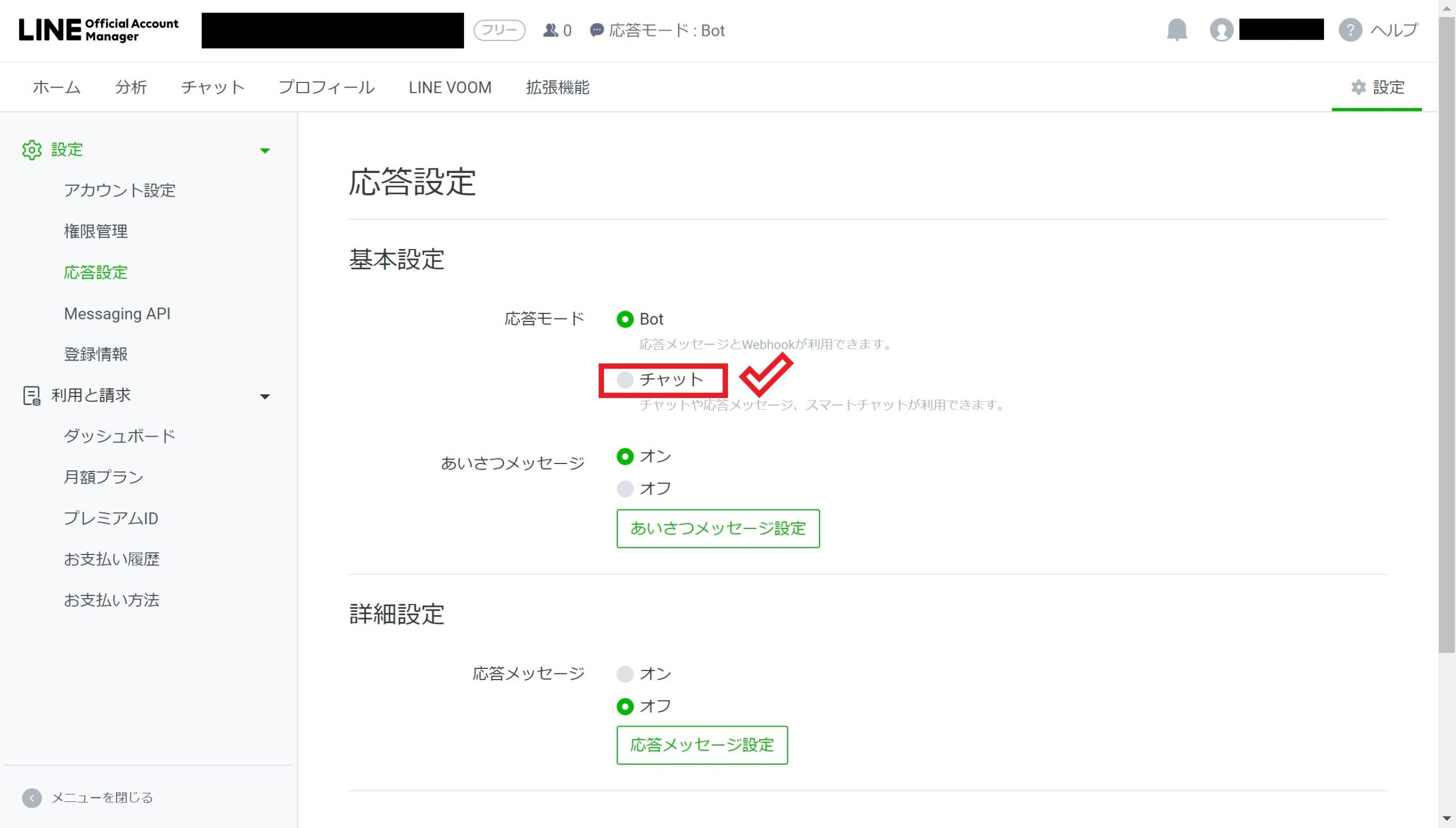 応答設定画面で「チャット」のボタンをクリック。