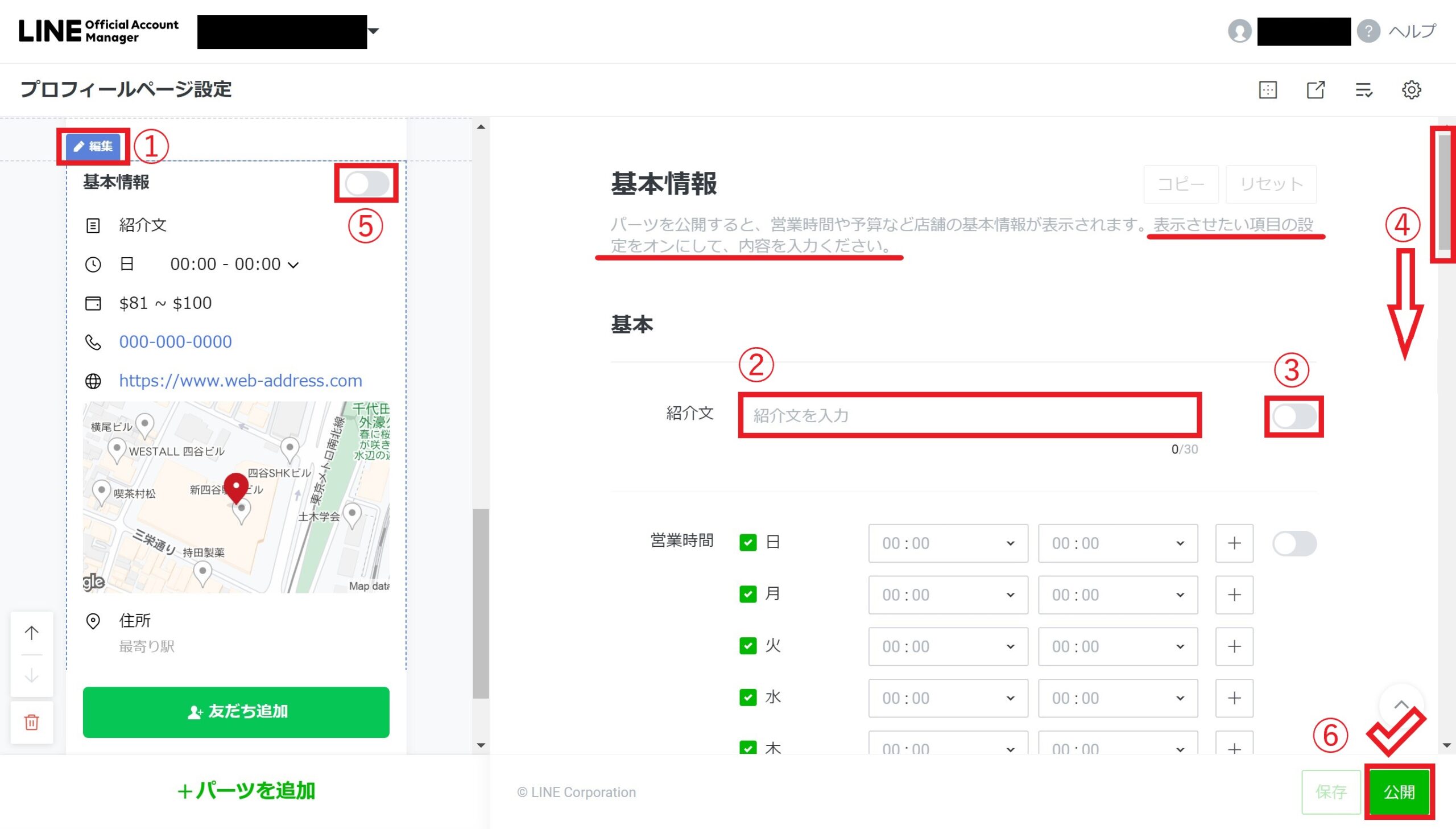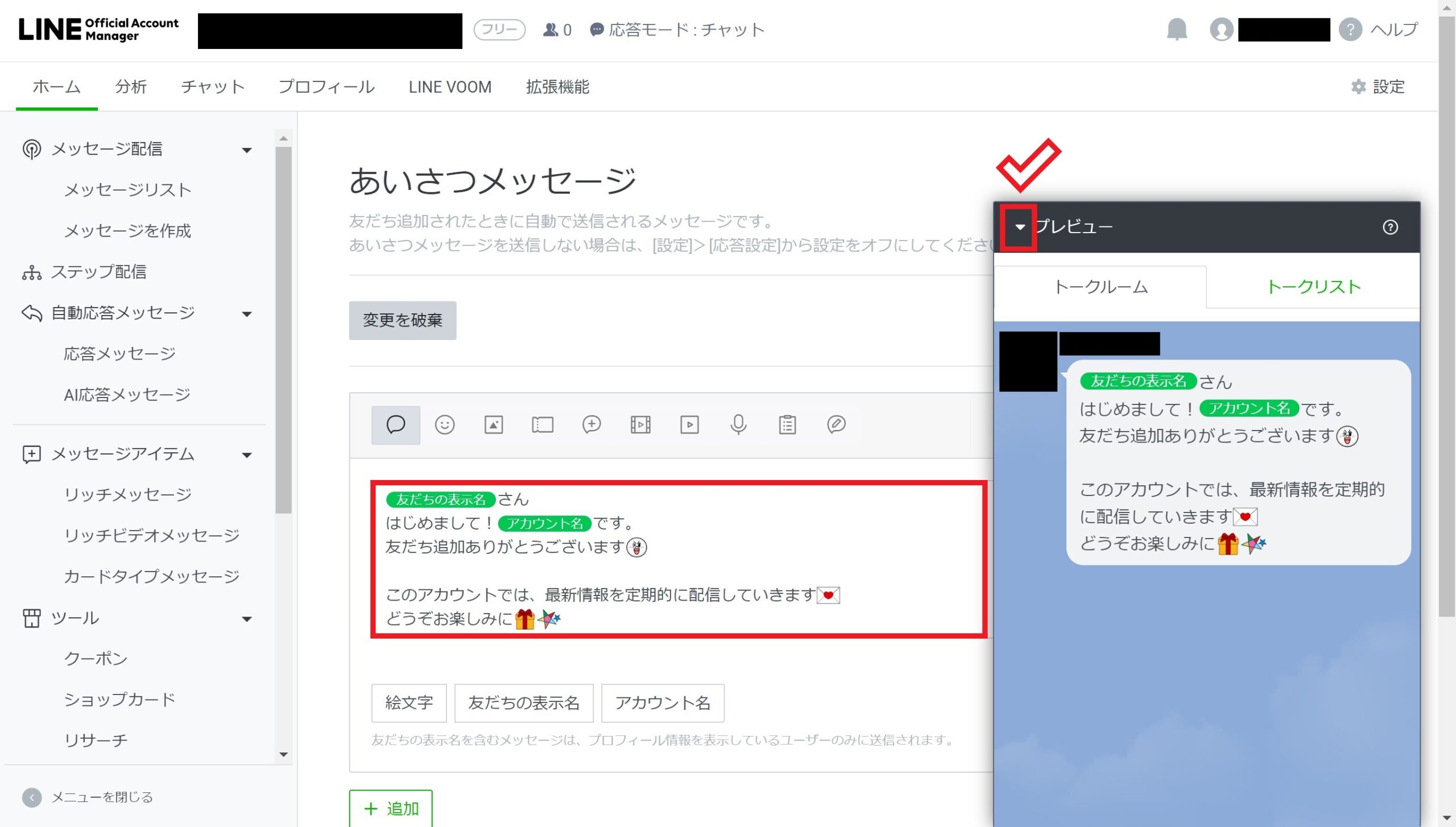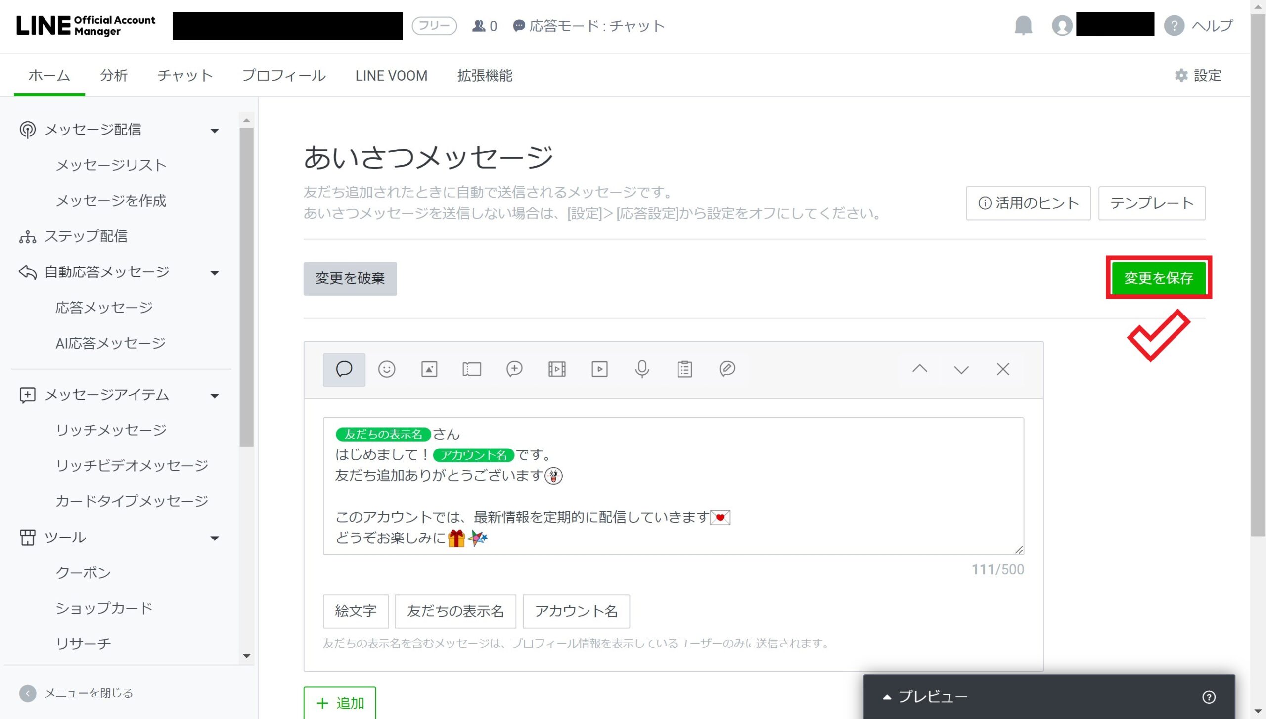赤枠の部分に、あなたのLINE公式アカウントでどんな内容を発信するのかを記入・編集してください。右側のプレビュー画面で、実際のLINEアプリ上でどのように表示されるか確認できます。