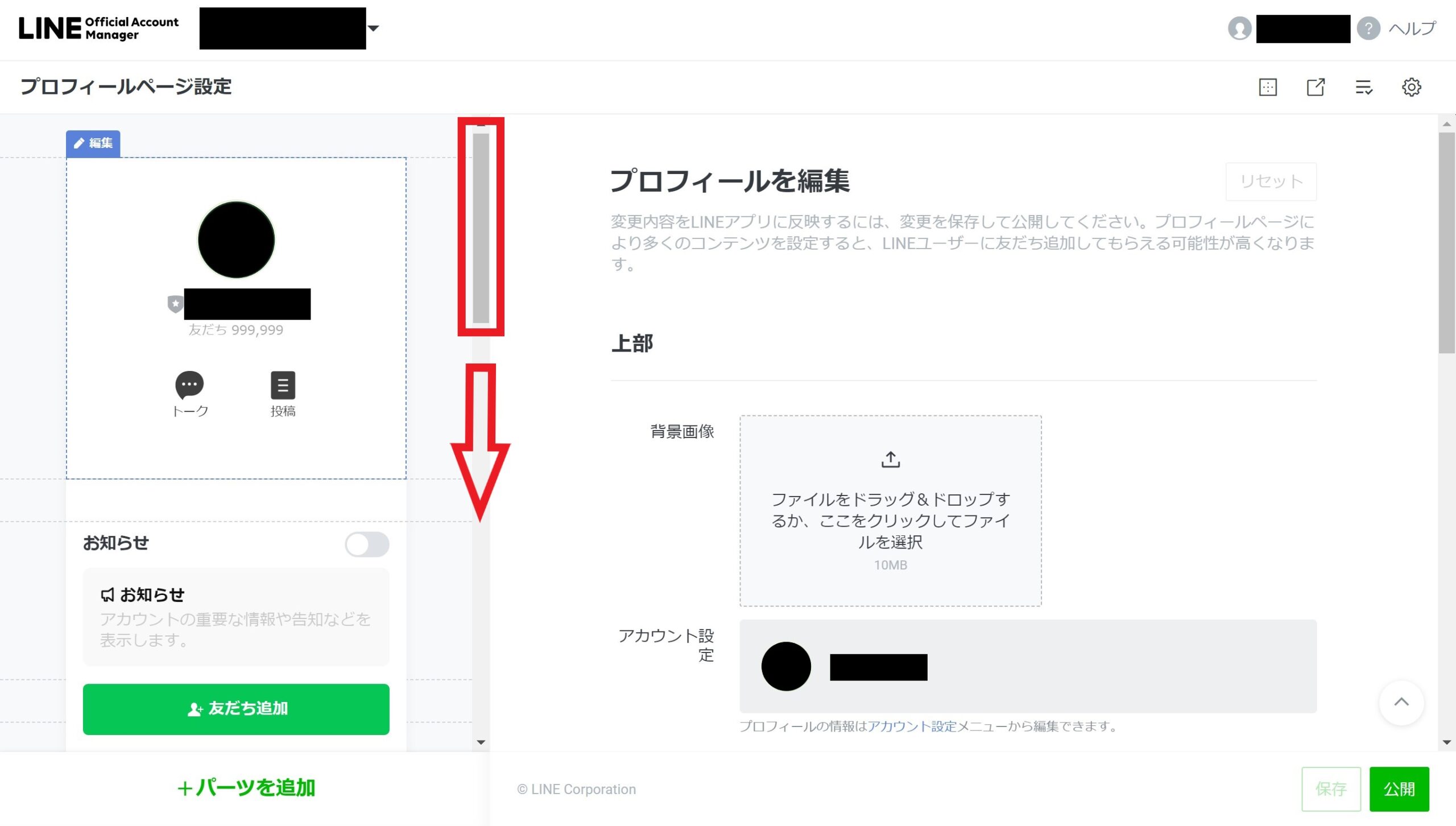 プロフィールページ設定ページになったら、左側の画面の「スクロールバー」を下にスクロールさせます。