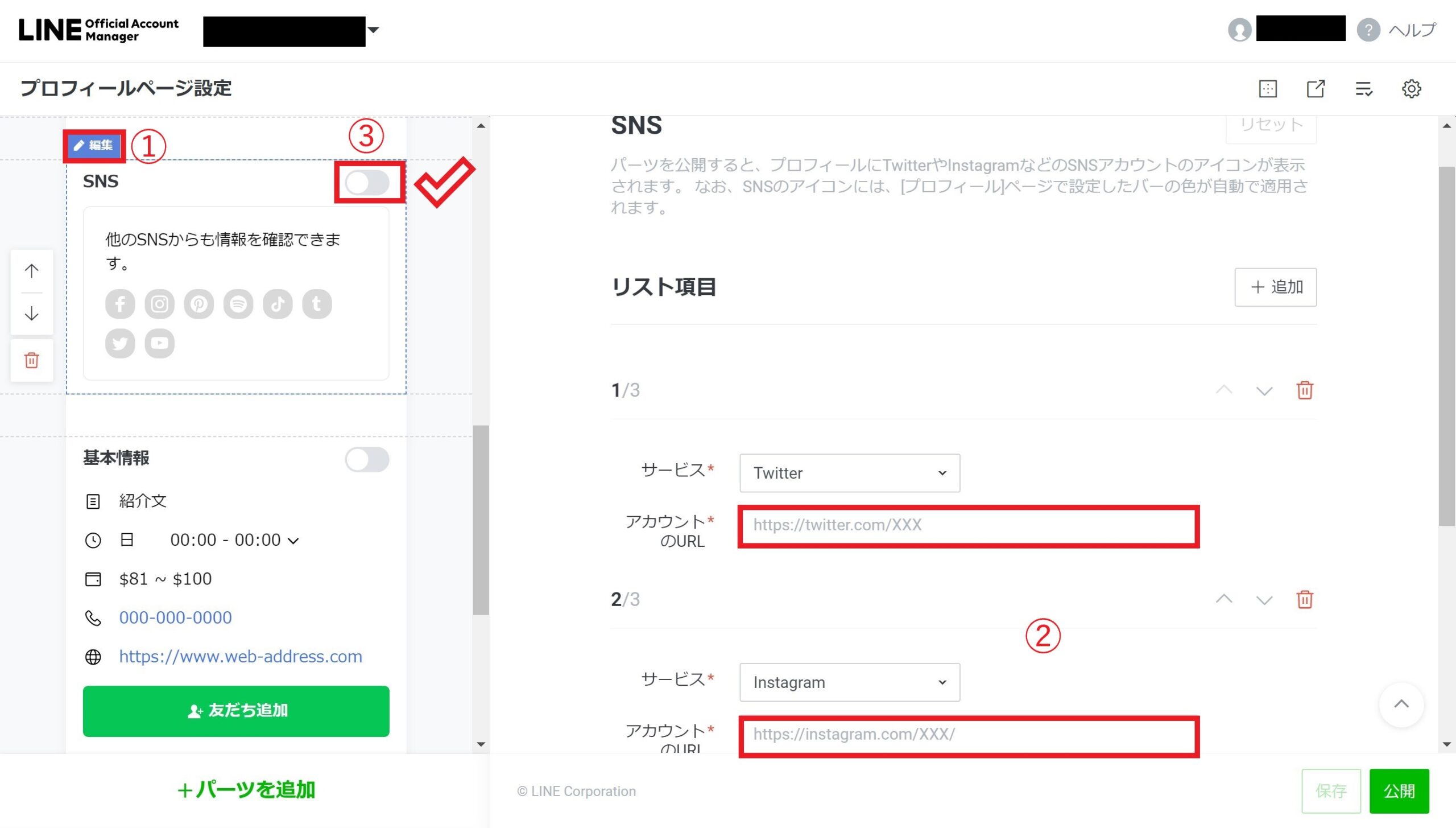 左側にSNSの編集領域が表示されますので、①「編集」をクリックし、②あなたの教室やサークル活動のSNSのアカウントのURLを入力します。そして最後に③のチェックをオンにします。