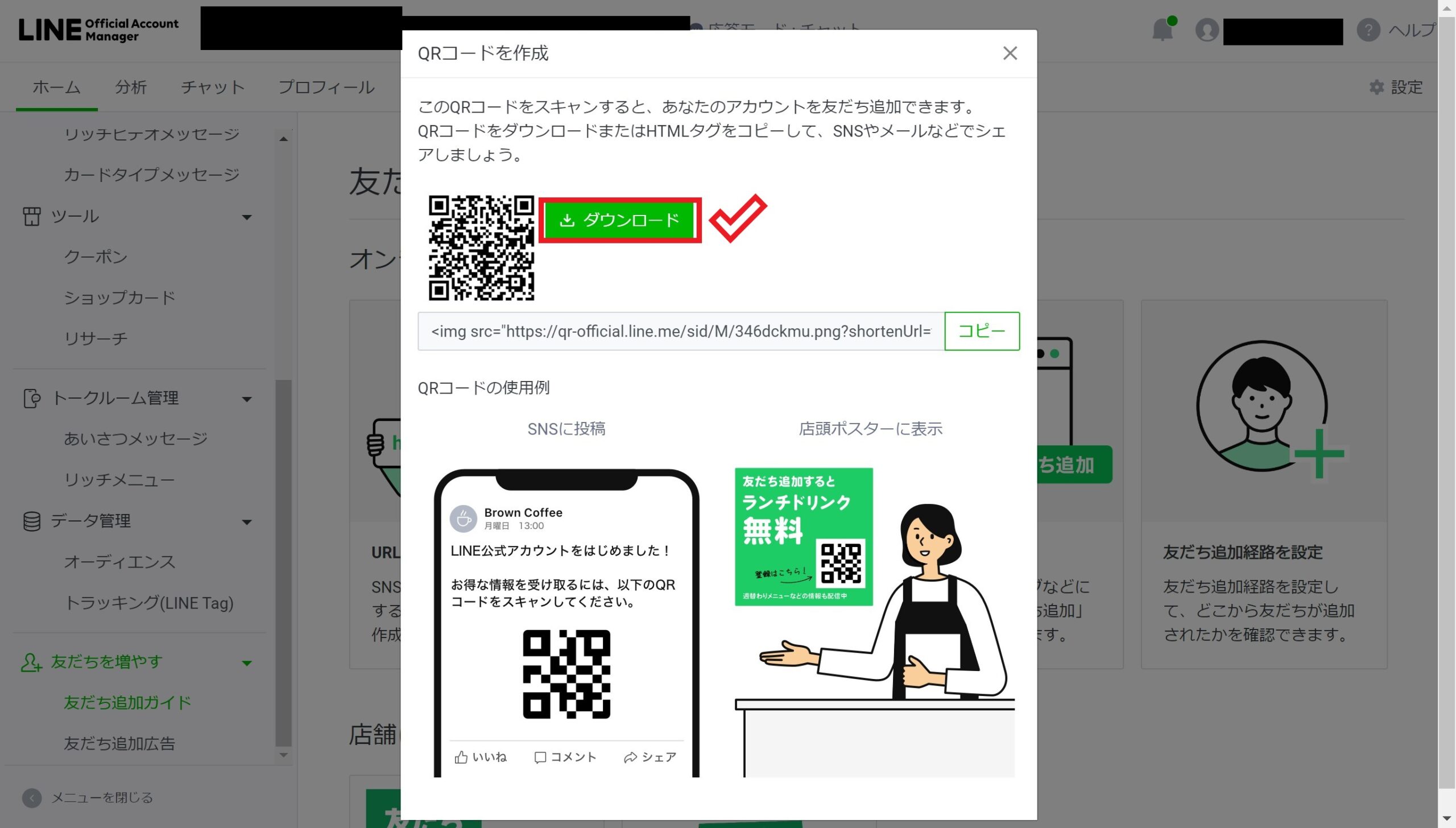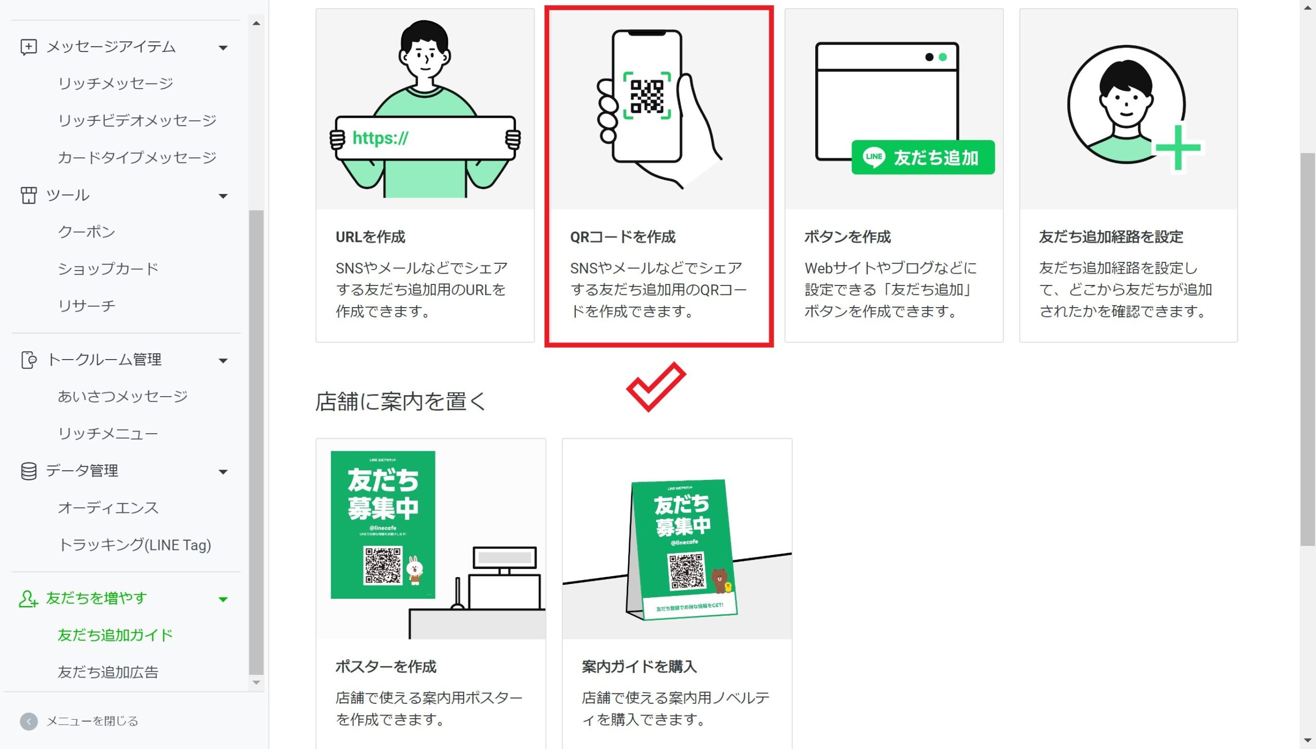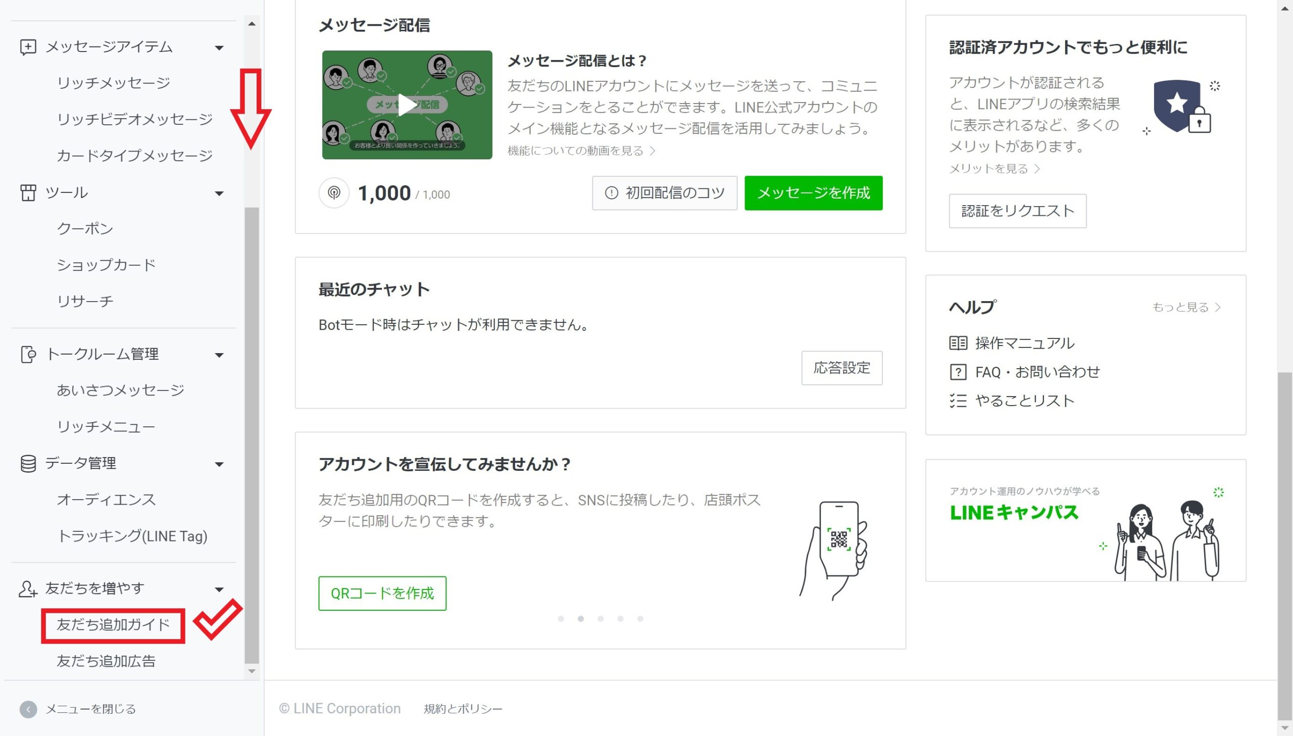 管理画面のトップに戻ったら、左側のバーを下にスクロールさせ、「友だち追加ガイド」をクリックします。