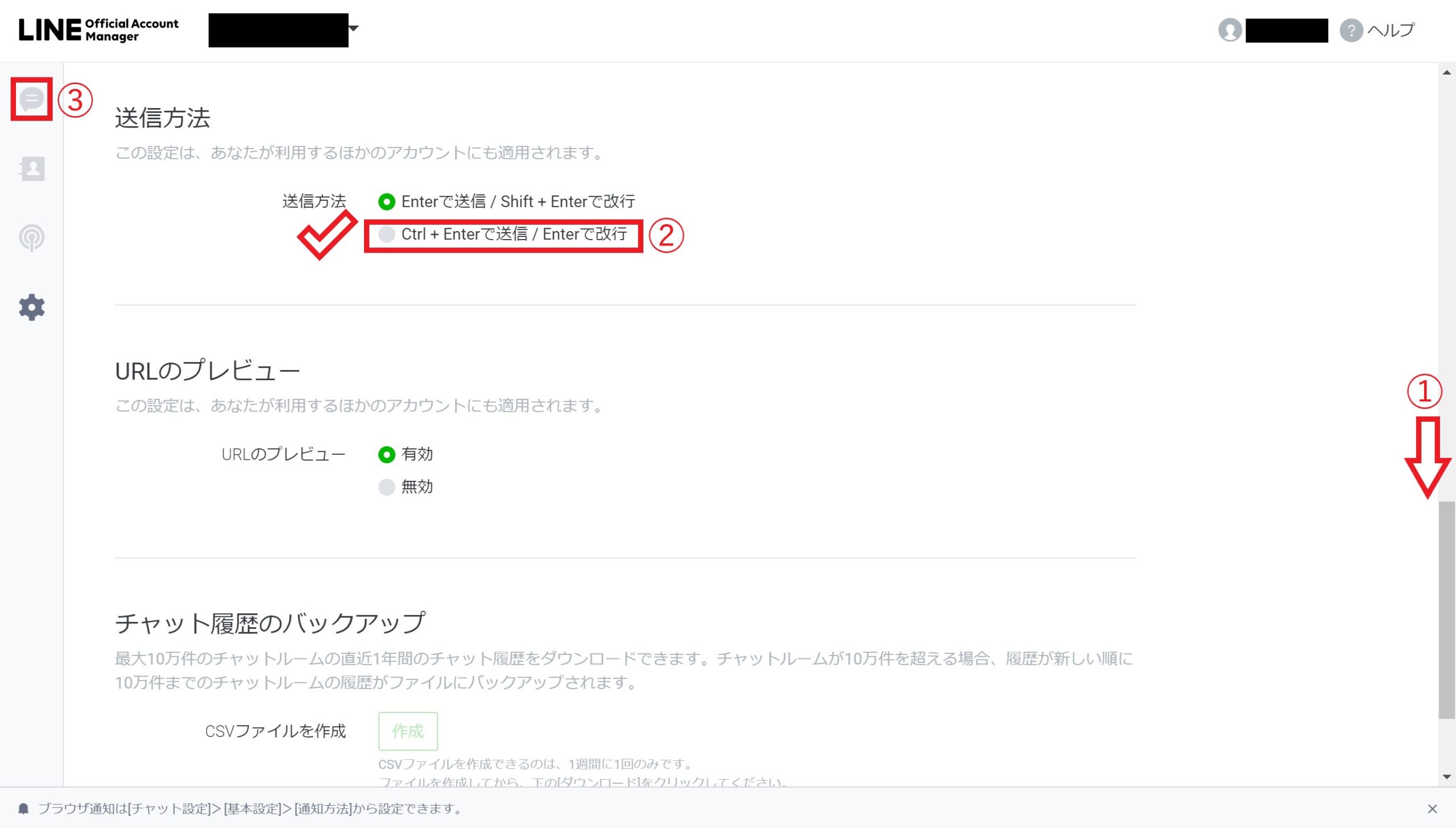 - ②「Ctrl + Enter で送信/Enterで改行」のボタンを選択します。