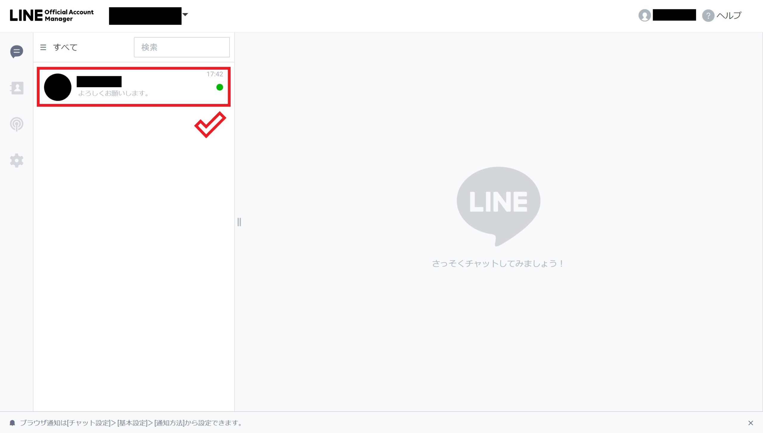 続いて、LINE公式アカウントで個々の友だちとの個別チャットの使い方を解説します。