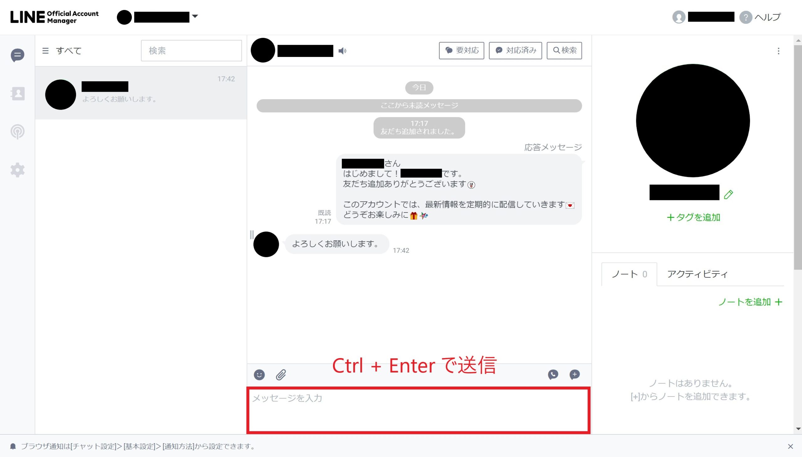 個別の友だちとのやり取りが表示されます。先ほど、個人LINEアカウントで送信した「よろしくお願いします。」が表示されていますね。
