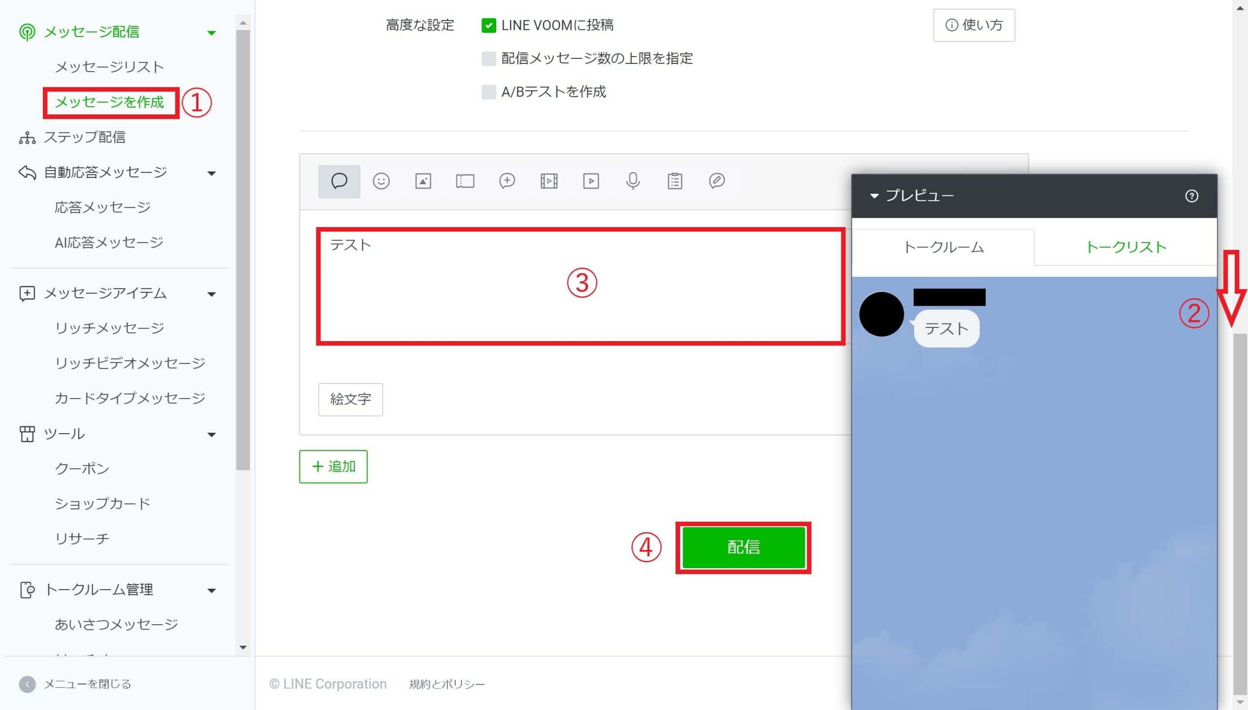 - ①左側のメニューで「メッセージの作成」をクリックします。