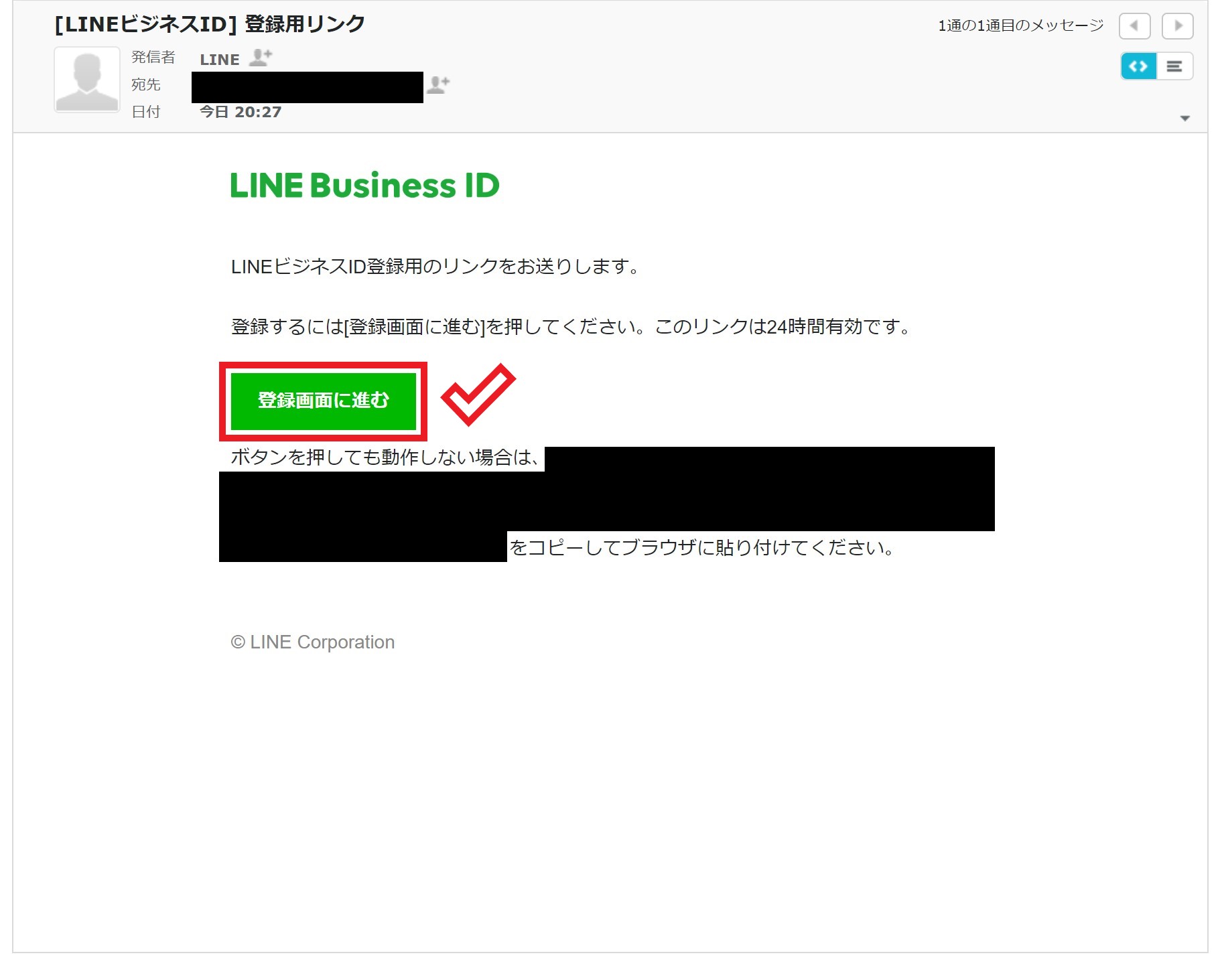 すると入力したメールアドレス宛にLINEからメールが届くので「登録画面に進む」をクリックします。