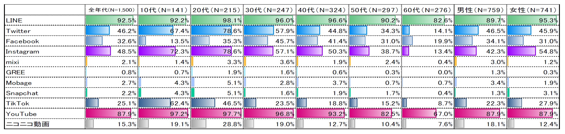 【令和3年度】主なソーシャルメディア系サービス/アプリ等の利用率(全年代・年代別)