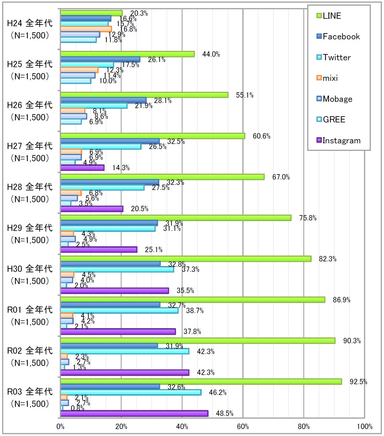 また、経年での傾向としても平成24年からLINEはトップの利用率を独走しています。他のSNSとしては、近年Instagramの利用率がTwitterを上回る影響力をもっています。