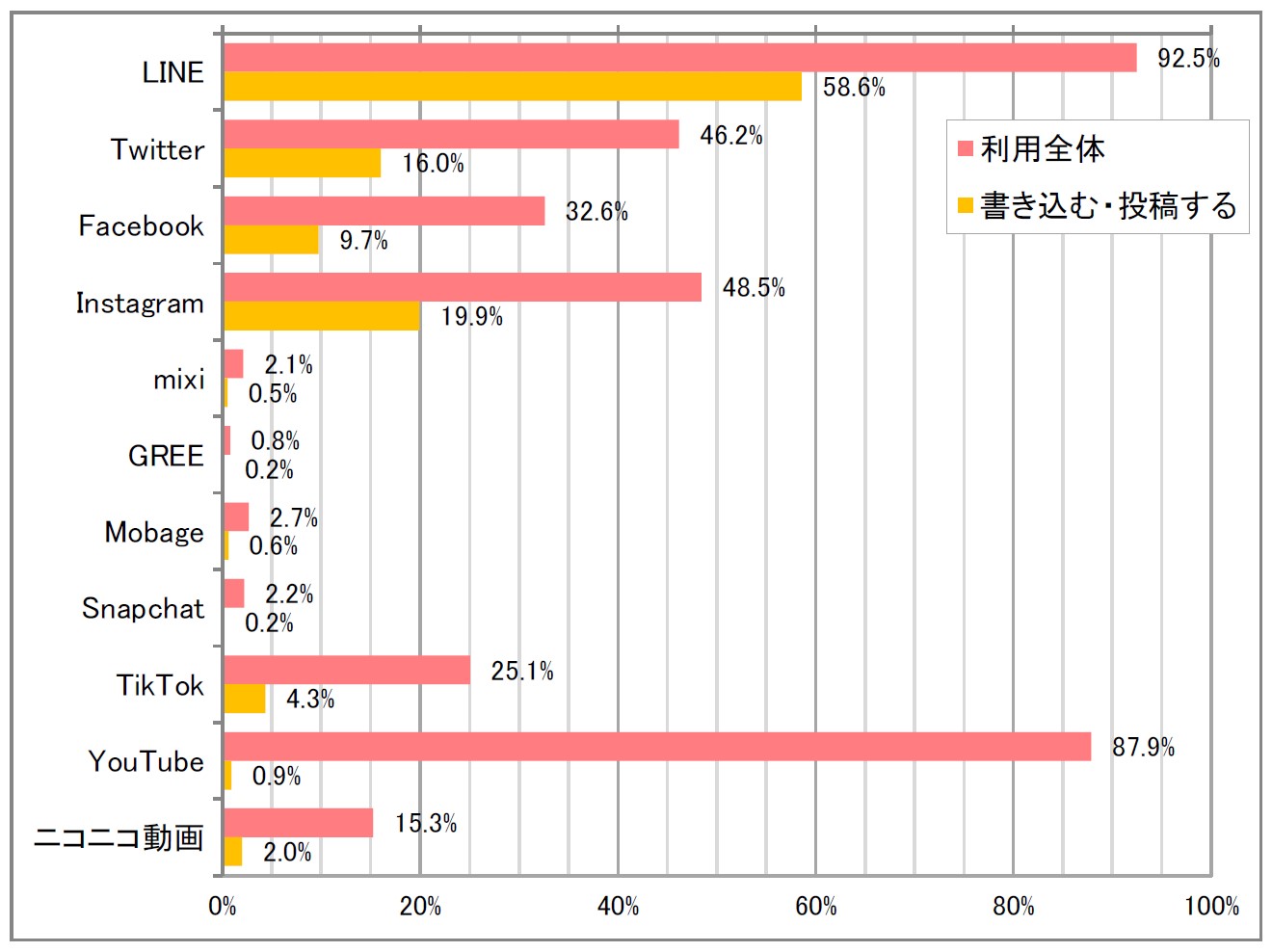 【令和3年度】主なソーシャルメディア系サービス/アプリ等の利用率(書き込む・投稿する)(全年代)